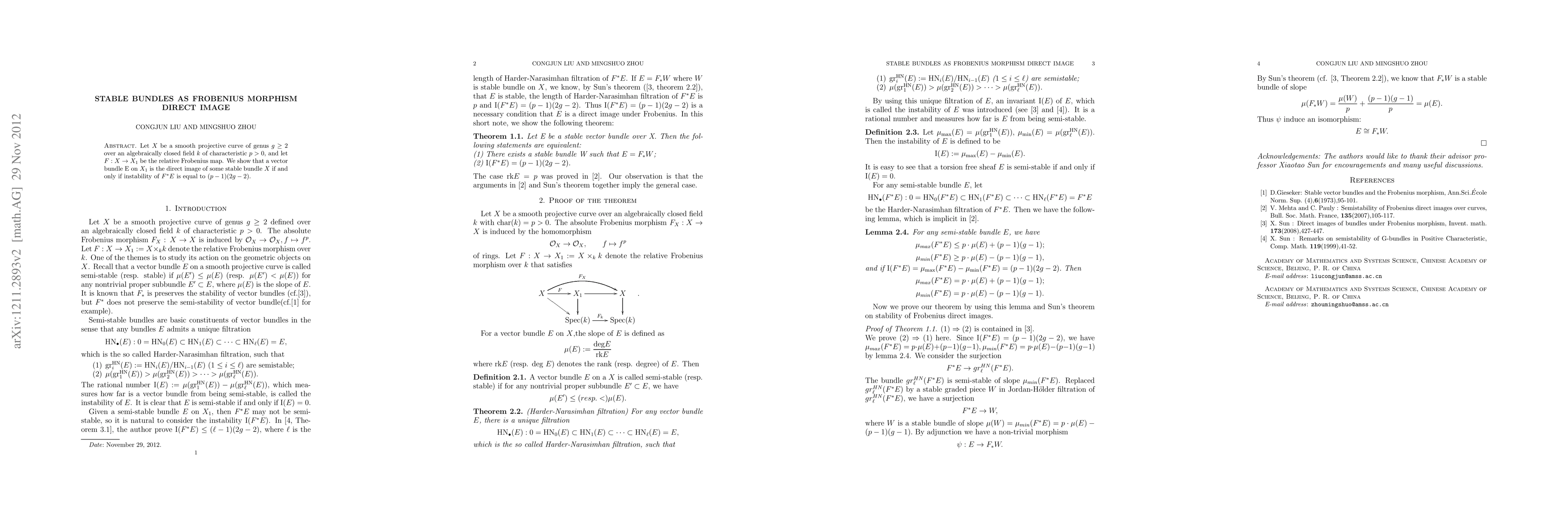 Let X be a smooth projective curve of genus $g\geq 2$ defined over an algebraically closed field k of characteristic $p>0$ and let $F:X\rightarrow X_{1}$ be the relative k-linear Frobenius map. We prove (Theorem 1.1) E is a stable bundle on $X_{1}$ with $I(E)= (p-1)(2g-2)$ if and only if E is the direct image of some stable bundle W on $X$.