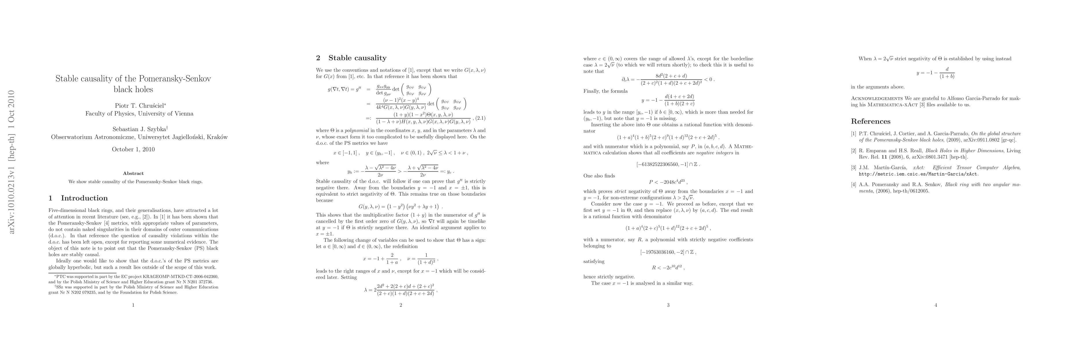 Summary: This paper demonstrates the stable causality of Pomeransky-Senkov black rings, providing evidence that these exotic black holes maintain consistent causal relationships in their spacetime structure.