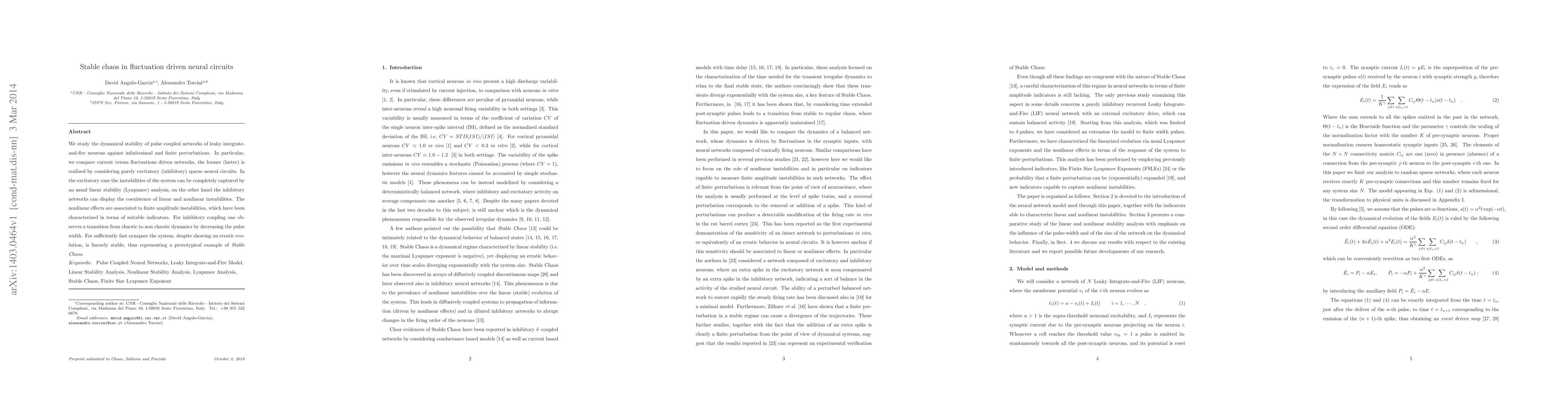 We study the dynamical stability of pulse coupled networks of leaky integrate-and-fire neurons against infinitesimal and finite perturbations. In particular, we compare current versus fluctuations driven networks, the former (latter) is realized by considering purely excitatory (inhibitory) sparse neural circuits. In the excitatory case the instabilities of the system can be completely captured by an usual linear stability (Lyapunov) analysis, on the other hand the inhibitory networks can display the coexistence of linear and nonlinear instabilities. The nonlinear effects are associated to finite amplitude instabilities, which have been characterized in terms of suitable indicators. For inhibitory coupling one observes a transition from chaotic to non chaotic dynamics by decreasing the pulse width. For sufficiently fast synapses the system, despite showing an erratic evolution, is linearly stable, thus representing a prototypical example of Stable Chaos.