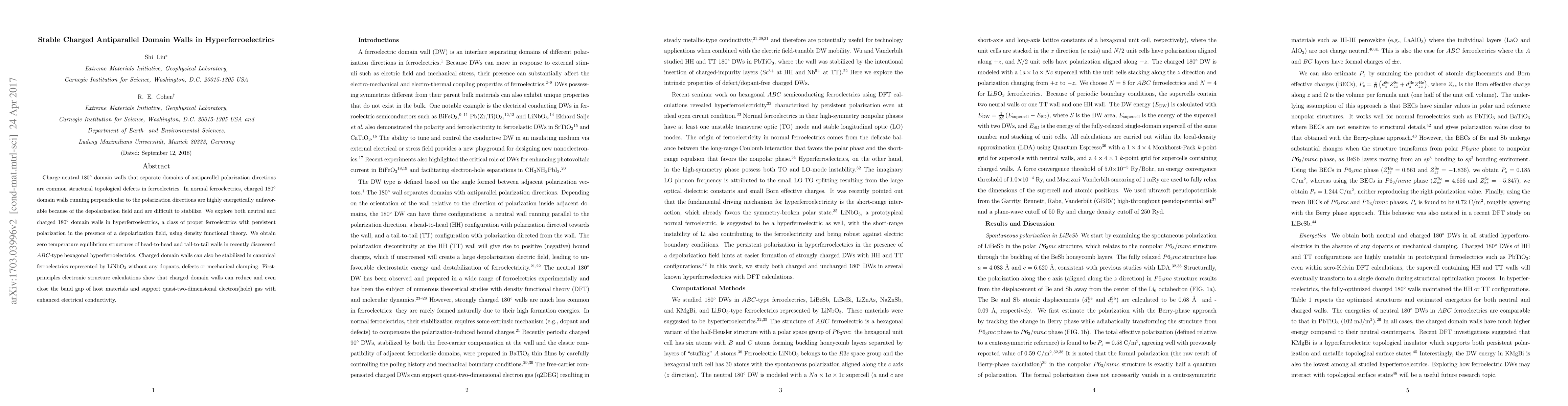 This paper investigates the stabilization of charged antiparallel domain walls in hyperferroelectrics using density functional theory, revealing that such walls can be stable in these materials and even in canonical ferroelectrics like LiNbO$_3$. The findings suggest that these charged domain walls can reduce the band gap and enhance electrical conductivity.