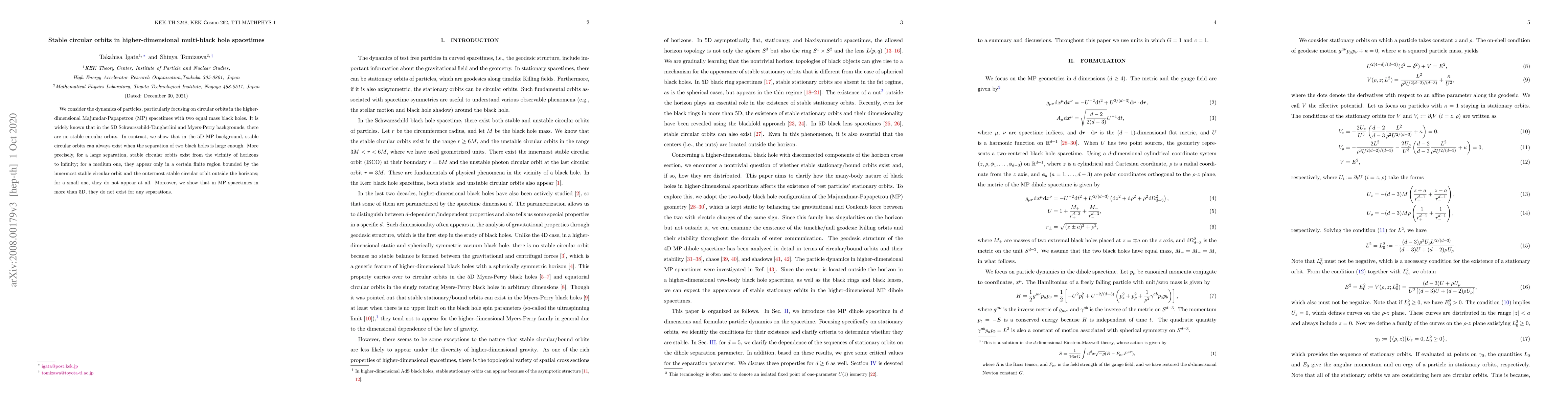 We consider the dynamics of particles, particularly focusing on circular orbits in the higher-dimensional Majumdar-Papapetrou (MP) spacetimes with two equal mass black holes. It is widely known that in the 5D Schwarzschild-Tangherlini and Myers-Perry backgrounds, there are no stable circular orbits. In contrast, we show that in the 5D MP background, stable circular orbits can always exist when the separation of two black holes is large enough. More precisely, for a large separation, stable circular orbits exist from the vicinity of horizons to infinity; for a medium one, they appear only in a certain finite region bounded by the innermost stable circular orbit and the outermost stable circular orbit outside the horizons; for a small one, they do not appear at all. Moreover, we show that in MP spacetimes in more than 5D, they do not exist for any separations.