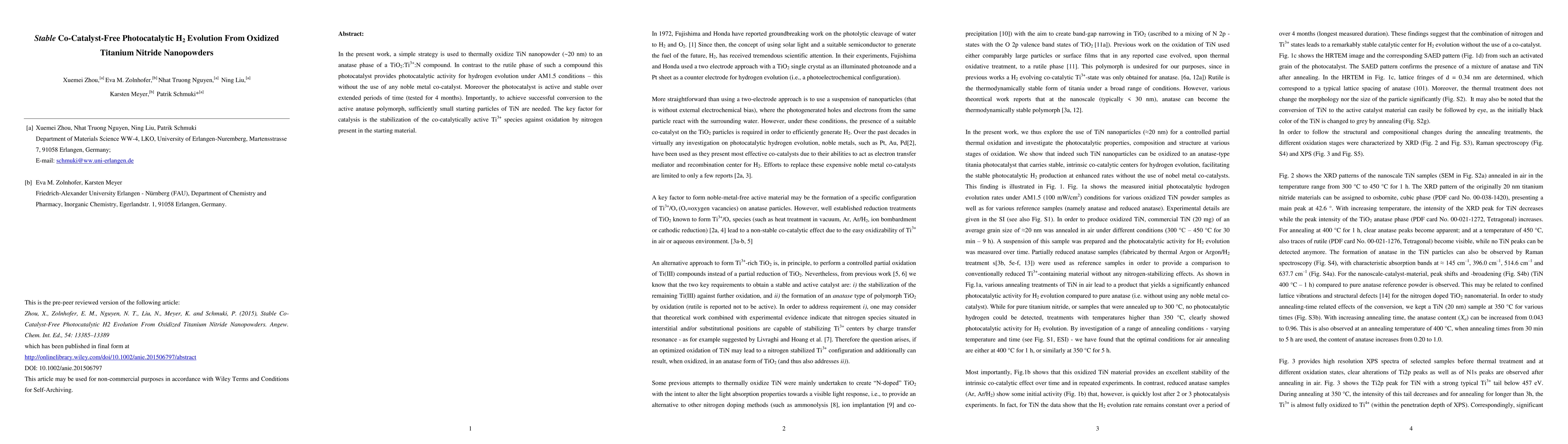 This paper presents a thermally oxidized TiN nanopowder that converts to an active anatase TiO2:Ti3+:N photocatalyst for hydrogen evolution without noble metal co-catalysts. The material maintains photocatalytic activity and stability over four months, highlighting the importance of small TiN particles and stabilization of Ti3+ species for effective catalysis.