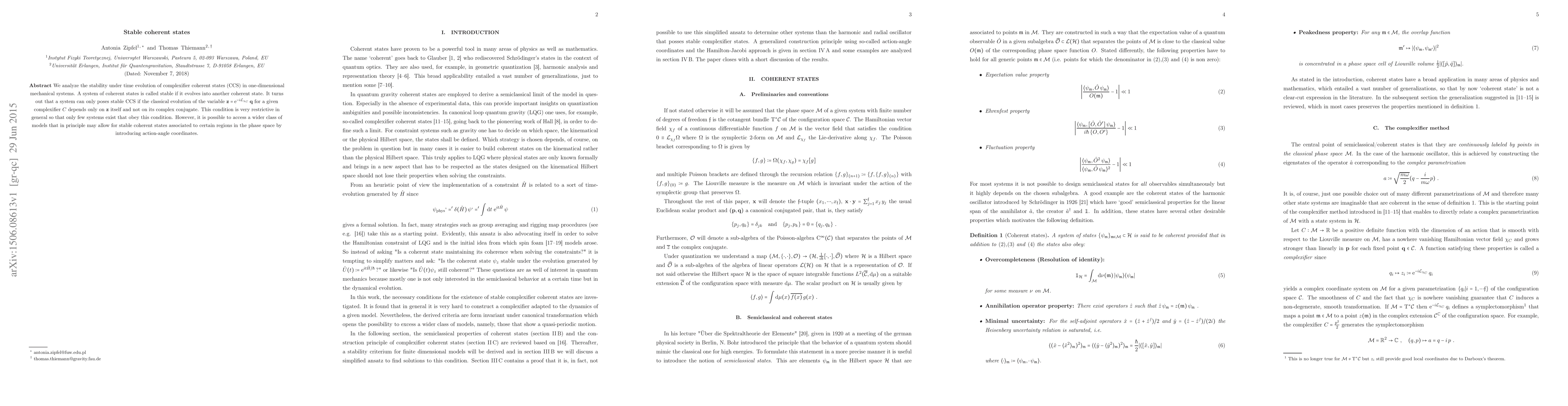 We analyze the stability under time evolution of complexifier coherent states (CCS) in one-dimensional mechanical systems. A system of coherent states is called stable if it evolves into another coherent state. It turns out that a system can only poses stable CCS if the classical evolution of the variable for a given complexifier C depends only on z itself and not on its complex conjugate. This condition is very restrictive in general so that only few systems exist that obey this condition. However, it is possible to access a wider class of models that in principle may allow for stable coherent states associated to certain regions in the phase space by introducing action-angle coordinates.