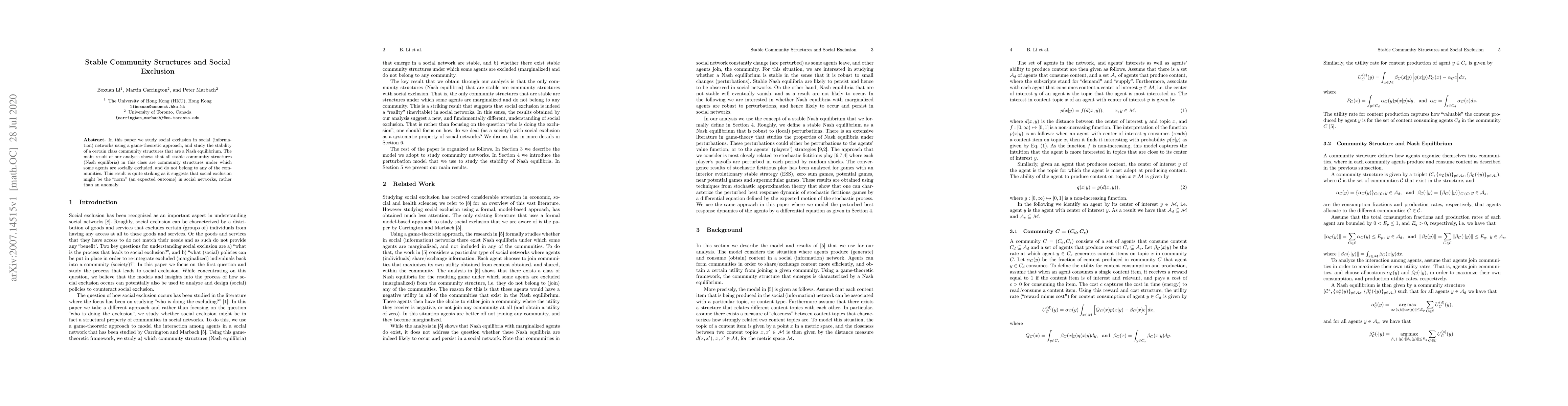 This paper employs game theory to analyze social exclusion in information networks, revealing that stable community structures, which are Nash equilibria, inherently include socially excluded agents. The findings suggest that social exclusion may be a common, rather than exceptional, outcome in social networks.