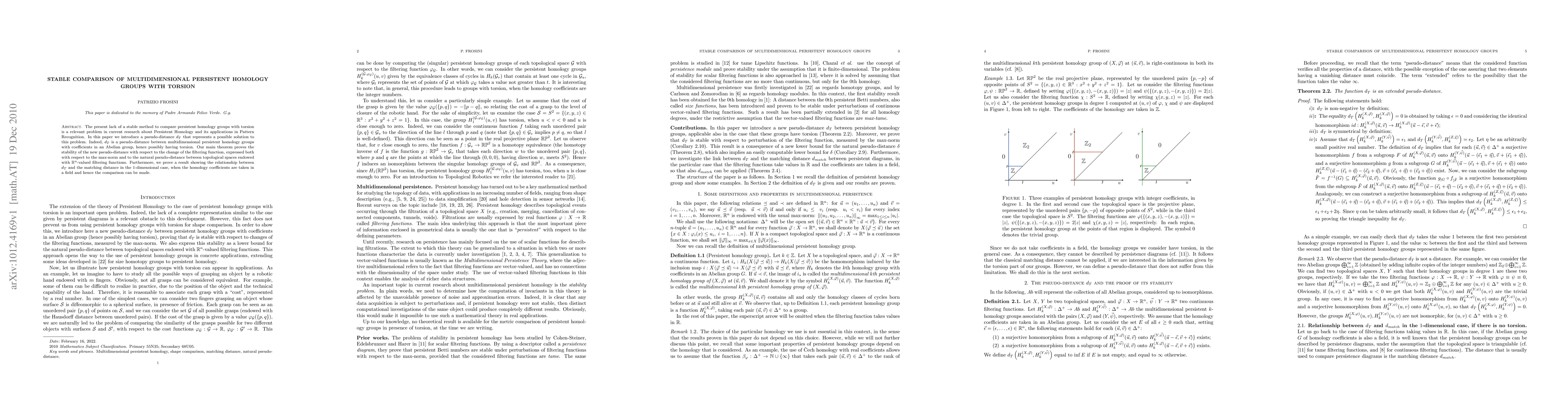 This paper introduces a new pseudo-distance d_T to stably compare multidimensional persistent homology groups with torsion, proving its stability under changes in filtering functions. It also establishes a connection between d_T and the matching distance in the 1-dimensional case when homology coefficients are in a field.