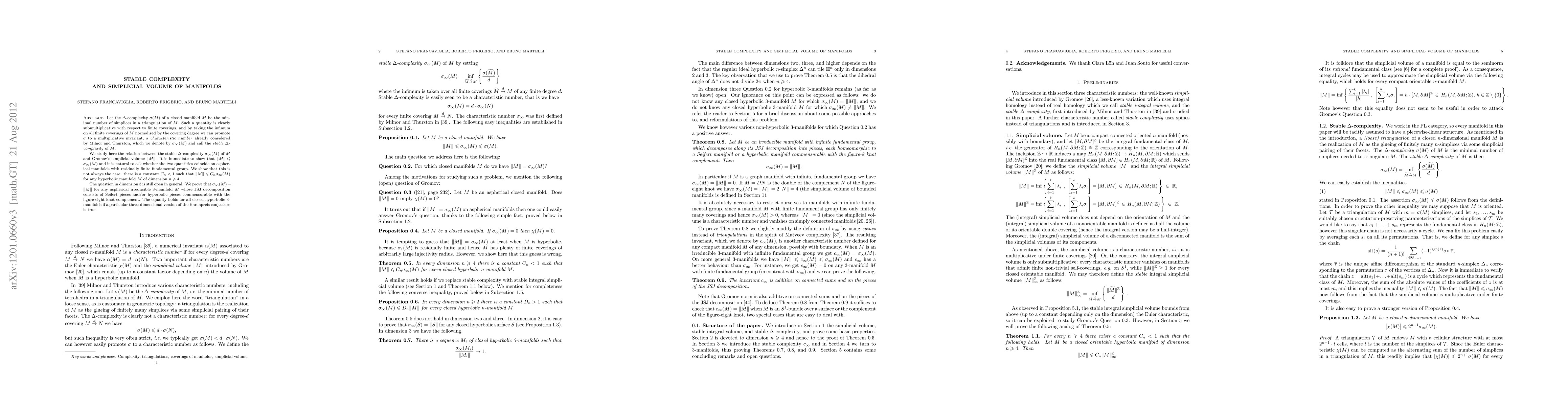 Let the complexity of a closed manifold M be the minimal number of simplices in a triangulation of M. Such a quantity is clearly submultiplicative with respect to finite coverings, and by taking the infimum on all finite coverings of M normalized by the covering degree we can promote it to a multiplicative invariant, a characteristic number already considered by Milnor and Thurston, which call the "stable complexity" of M. We study here the relation between the stable complexity of M and Gromov's simplicial volume ||M||. It is immediate to show that ||M|| is smaller or equal than the stable complexity of M and it is natural to ask whether the two quantities coincide on aspherical manifolds with residually finite fundamental group. We show that this is not always the case: there is a constant C_n<1 such that ||M|| is smaller than C_n times the stable complexity for any hyperbolic manifold M of dimension at least 4. The question in dimension 3 is still open in general. We prove that the stable complexity equals ||M|| for any aspherical irreducible 3-manifold M whose JSJ decomposition consists of Seifert pieces and/or hyperbolic pieces commensurable with the figure-eight knot complement. The equality holds for all closed hyperbolic 3-manifolds if a particular three-dimensional version of the Ehrenpreis conjecture is true.