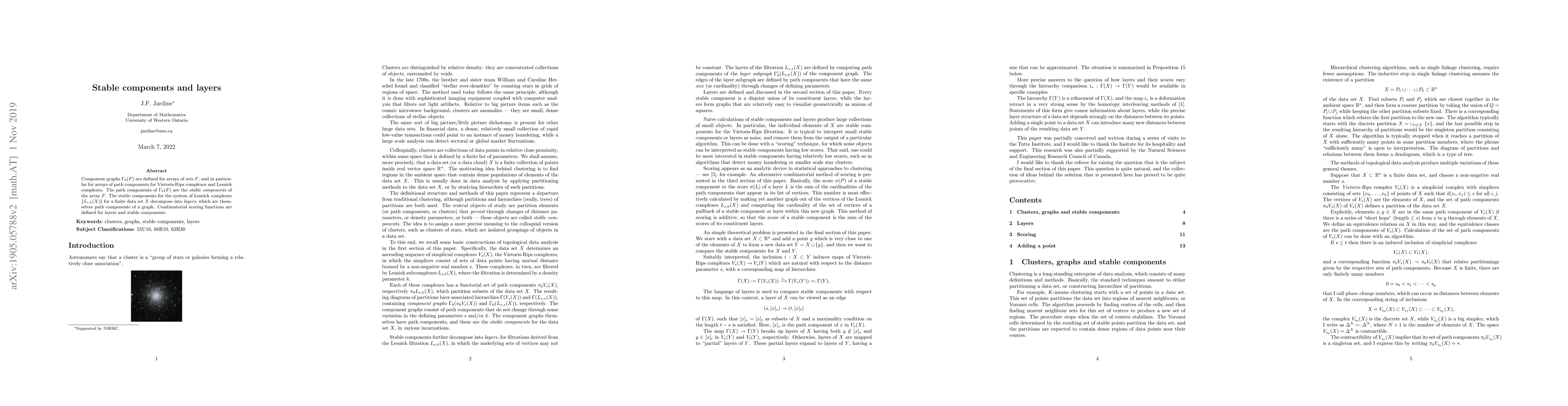 Component graphs $\Gamma_{0}(F)$ are defined for arrays of sets $F$, and in particular for arrays of path components for Vietoris-Rips complexes and Lesnick complexes. The path components of $\Gamma_{0}(F)$ are the {\it stable components} of the array $F$. The stable components for the system of Lesnick complexes $\{ L_{s,k}(X) \}$ for a finite data set $X$ decompose into layers, which are themselves path components of a graph. Combinatorial scoring functions are defined for layers and stable components.