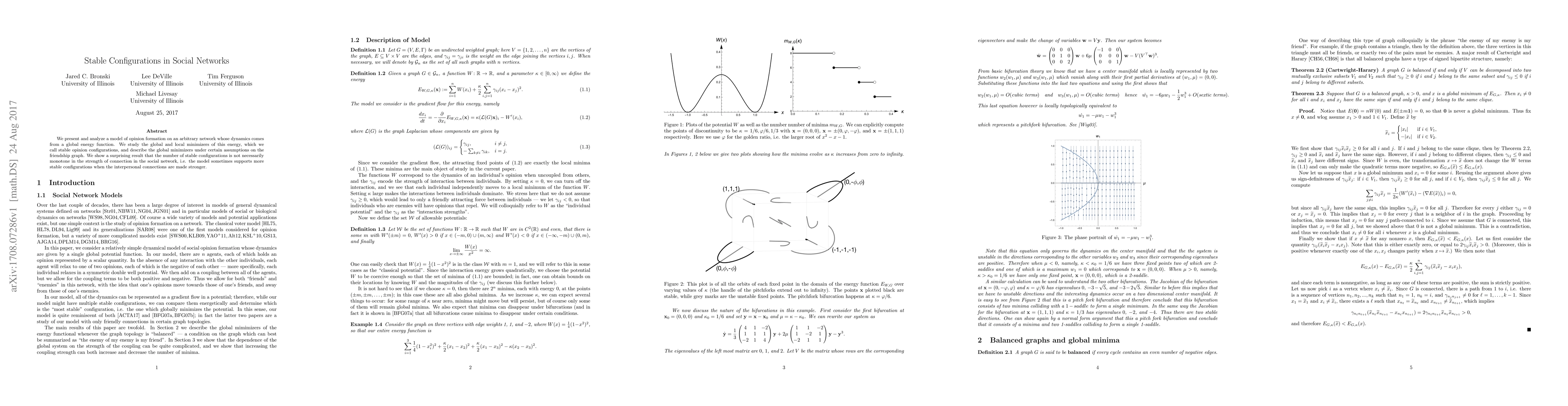 This paper models opinion formation on social networks using a global energy function, identifying stable opinion configurations as global and local minimizers. It reveals that stronger connections do not always lead to a monotone increase in the number of stable configurations, defying conventional expectations.
