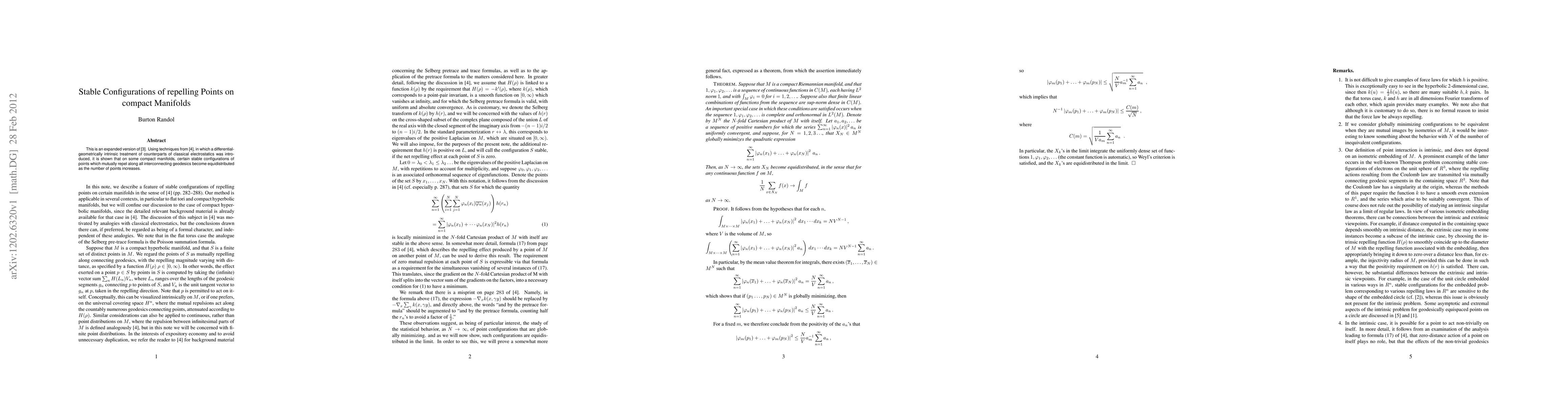 This is an expanded version of [arXiv:1107.4836v1 [math.DS]]. Using techniques from [Chapter XI, The Selberg Trace Formula, in Eigenvalues in Riemannian Geometry, by Isaac Chavel], in which a differential-geometrically intrinsic treatment of counterparts of classical electrostatics was introduced, it is shown that on some compact manifolds, certain stable configurations of points which mutually repel along all interconnecting geodesics become equidistributed as the number of points increases.