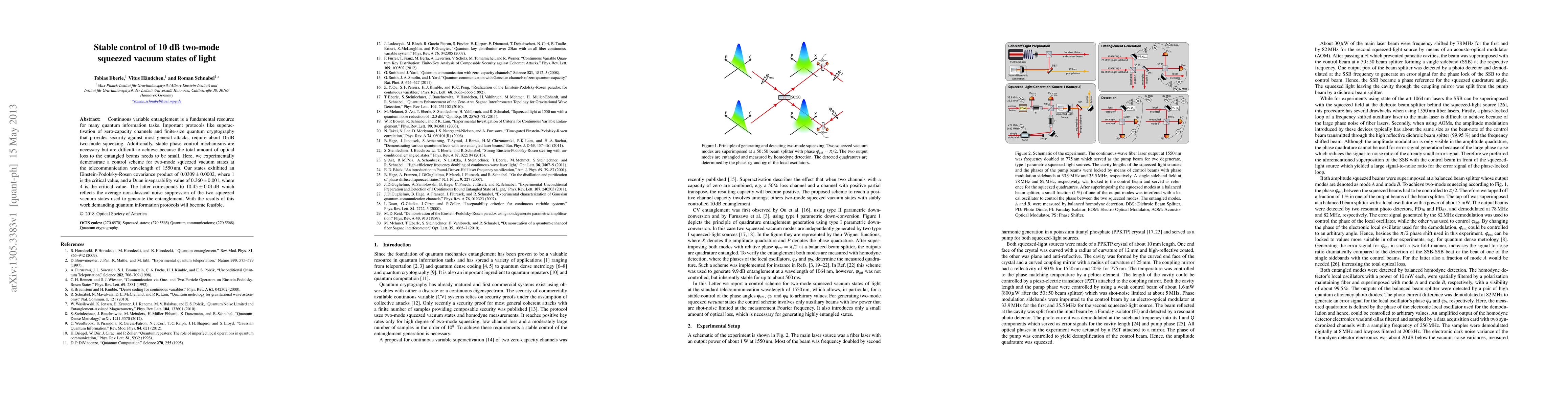 This paper demonstrates a control scheme for generating 10 dB two-mode squeezed vacuum states at 1550 nm, essential for quantum information tasks. The achieved entanglement measures show significant non-classical noise suppression, paving the way for feasible quantum protocols.
