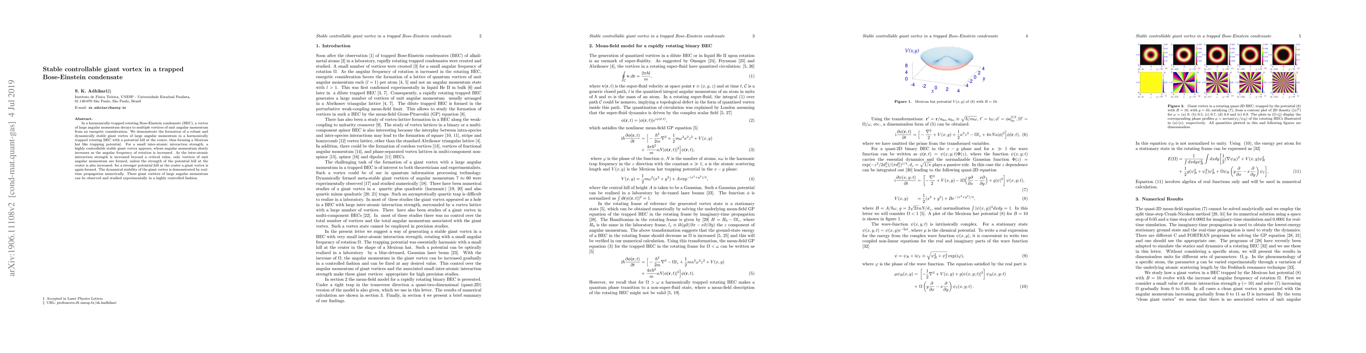 This paper demonstrates the formation of a stable giant vortex in a rotating Bose-Einstein condensate using a Mexican hat-like trapping potential, showing that under certain conditions, these vortices can maintain large angular momentum and remain dynamically stable. The study highlights the controllability of these giant vortices through manipulation of inter-atomic interactions and central potential strength.
