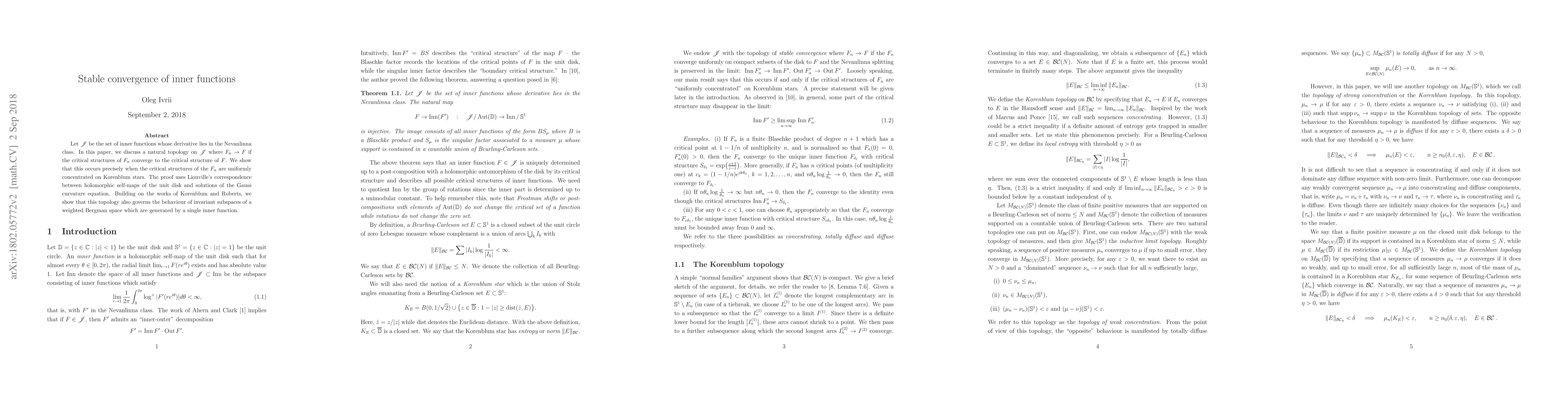 Let $\mathscr J$ be the set of inner functions whose derivative lies in the Nevanlinna class. In this paper, we discuss a natural topology on $\mathscr J$ where $F_n \to F$ if the critical structures of $F_n$ converge to the critical structure of $F$. We show that this occurs precisely when the critical structures of the $F_n$ are uniformly concentrated on Korenblum stars. The proof uses Liouville's correspondence between holomorphic self-maps of the unit disk and solutions of the Gauss curvature equation. Building on the works of Korenblum and Roberts, we show that this topology also governs the behaviour of invariant subspaces of a weighted Bergman space which are generated by a single inner function.