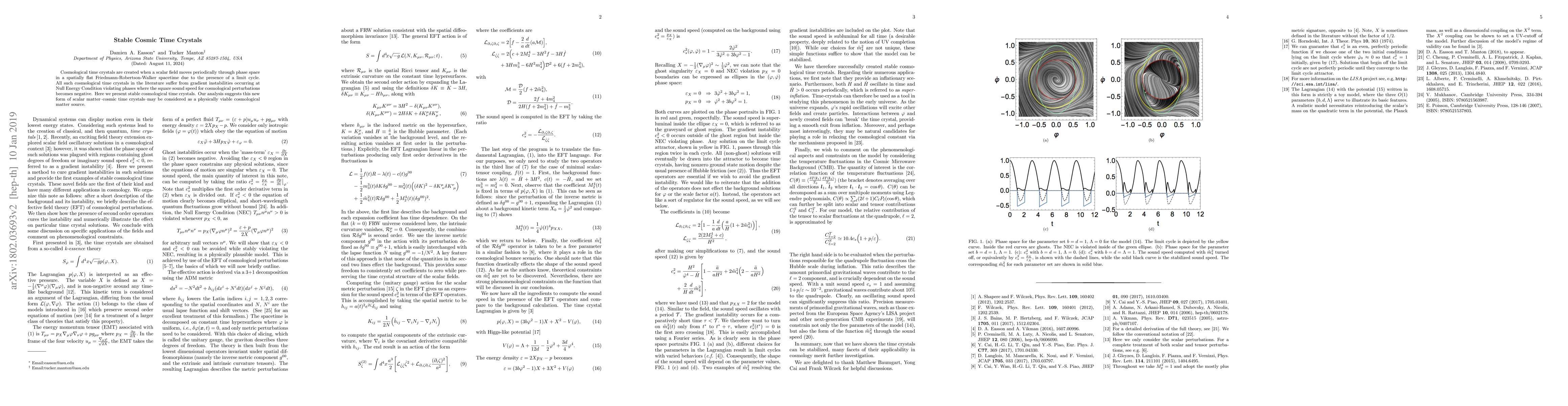 Cosmological time crystals are created when a scalar field moves periodically through phase space in a spatially flat Friedmann-Robertson-Walker spacetime due to the presence of a limit cycle. All such cosmological time crystals in the literature suffer from gradient instabilities occurring at Null Energy Condition violating phases where the square sound speed for cosmological perturbations becomes negative. Here we present stable cosmological time crystals. Our analysis suggests this new form of scalar matter--cosmic time crystals--may be considered as a physically viable cosmological matter source.