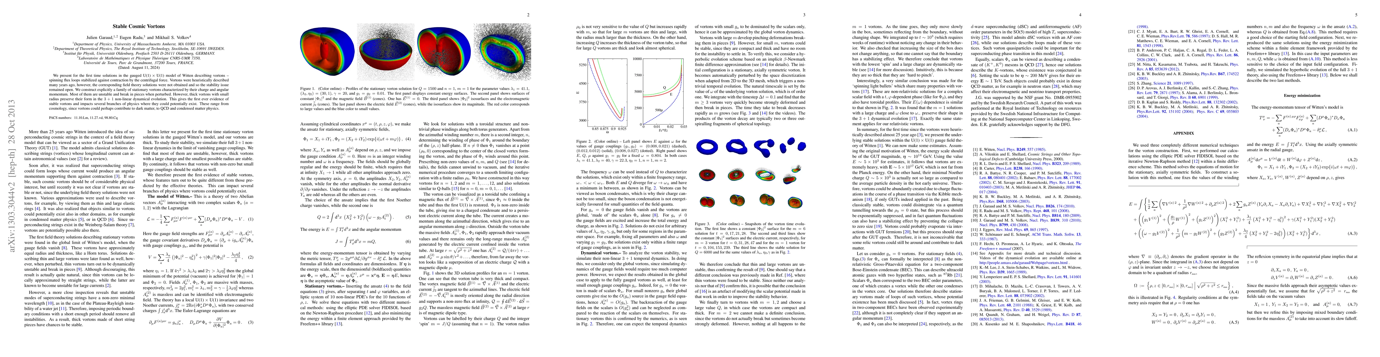 This paper presents the first field theory solutions for vortons, stable spinning flux loops in a gauged $U(1)\times U(1)$ model, showing that only thick vortons with small radius remain stable under perturbations. These findings have implications for cosmology, dark matter, and various branches of physics including QCD and condensed matter.