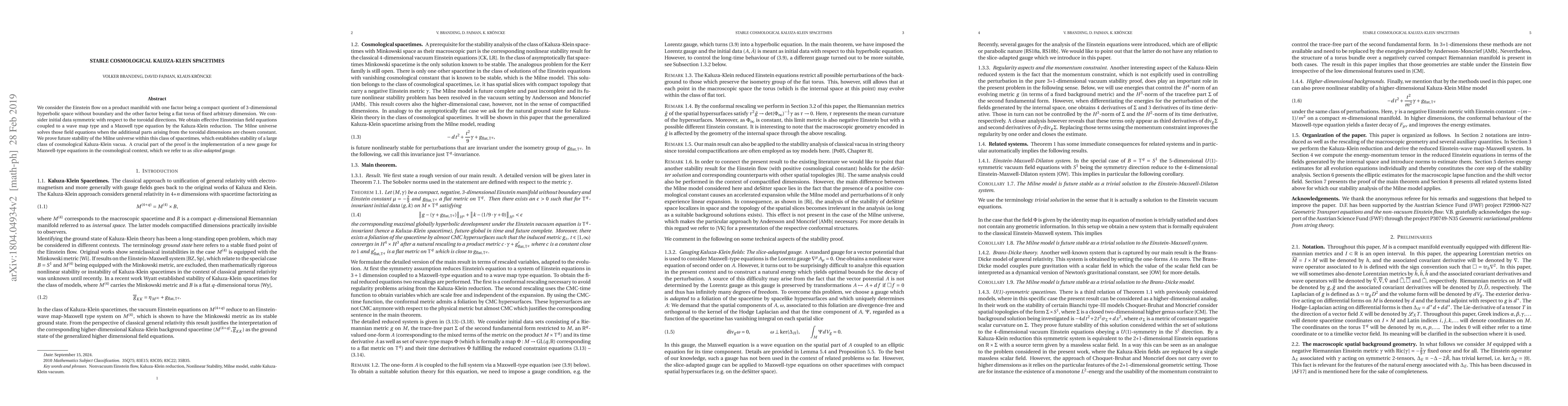 This research paper investigates stable cosmological Kaluza-Klein Spacetimes, finding that a specific universe called the Milne universe is future stable in a large class of spacetimes.