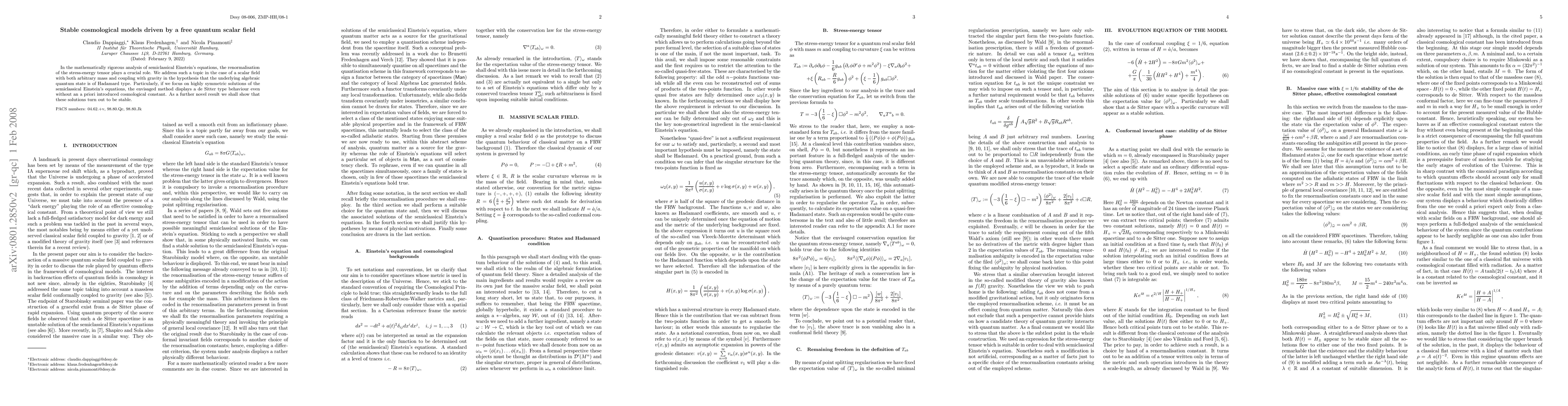 In the mathematically rigorous analysis of semiclassical Einstein's equations, the renormalisation of the stress-energy tensor plays a crucial role. We address such a topic in the case of a scalar field with both arbitrary mass and coupling with gravity in the hypothesis that the underlying algebraic quantum state is of Hadamard type. Particularly, if we focus on highly symmetric solutions of the semiclassical Einstein's equations, the envisaged method displays a de Sitter type behaviour even without an a priori introduced cosmological constant. As a further novel result we shall show that these solutions turn out to be stable.