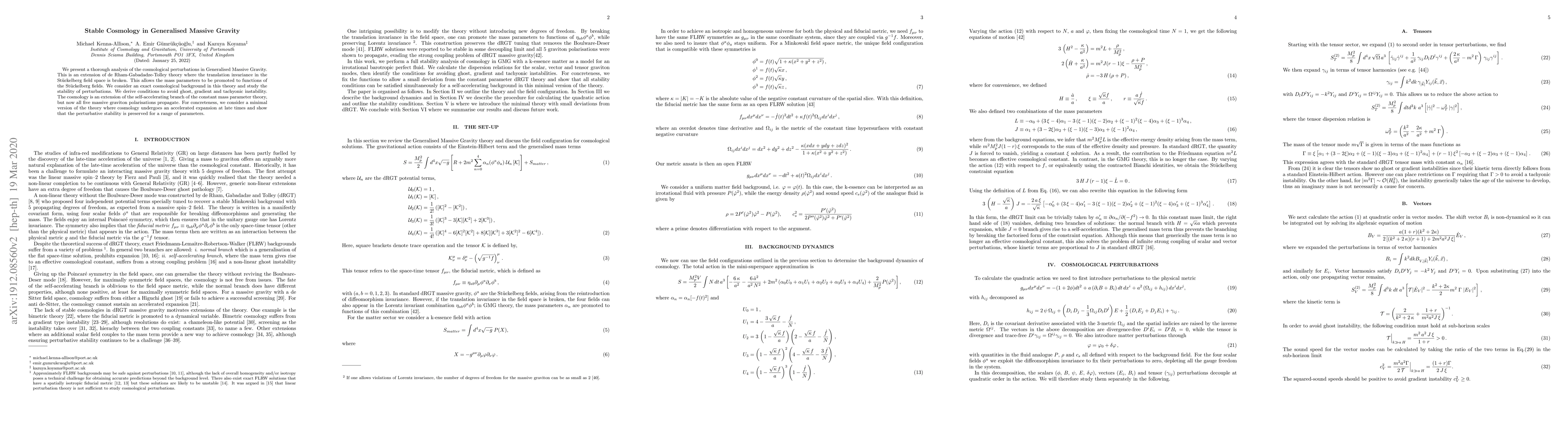 The paper presents a detailed derivation of stability conditions for cosmological perturbations in Generalised Massive Gravity, extending previous work on de Rham-Gabadadze-Tolley theory and addressing the strong coupling problem.