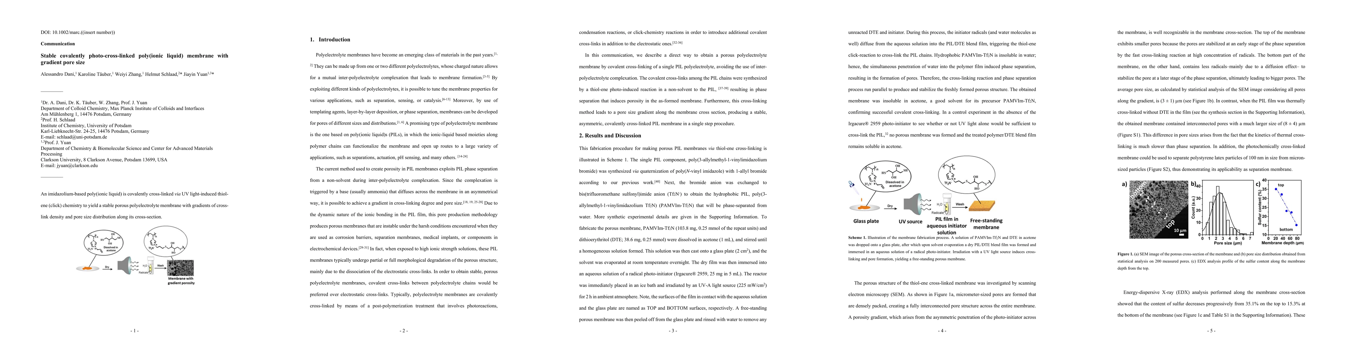 An imidazolium-based poly(ionic liquid) is covalently cross-linked via UV light-induced thiolene (click) chemistry to yield a stable porous polyelectrolyte membrane with gradients of crosslink density and pore size distribution along its cross-section.