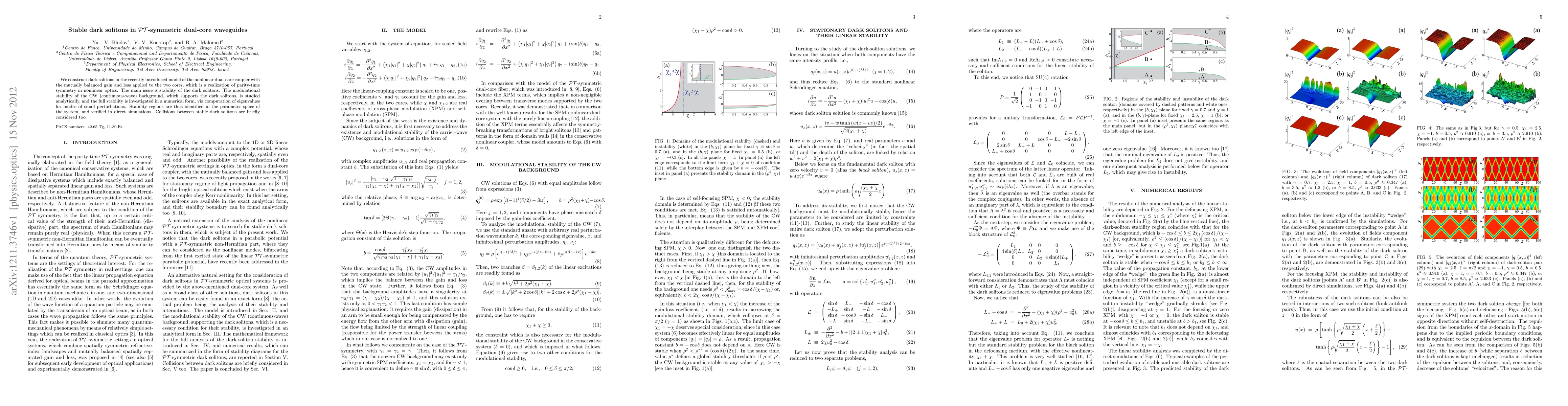 This paper constructs stable dark solitons in PT-symmetric dual-core waveguides, analyzing their modulational stability analytically and numerically. Stability regions are identified and verified through direct simulations, with brief consideration of soliton collisions.