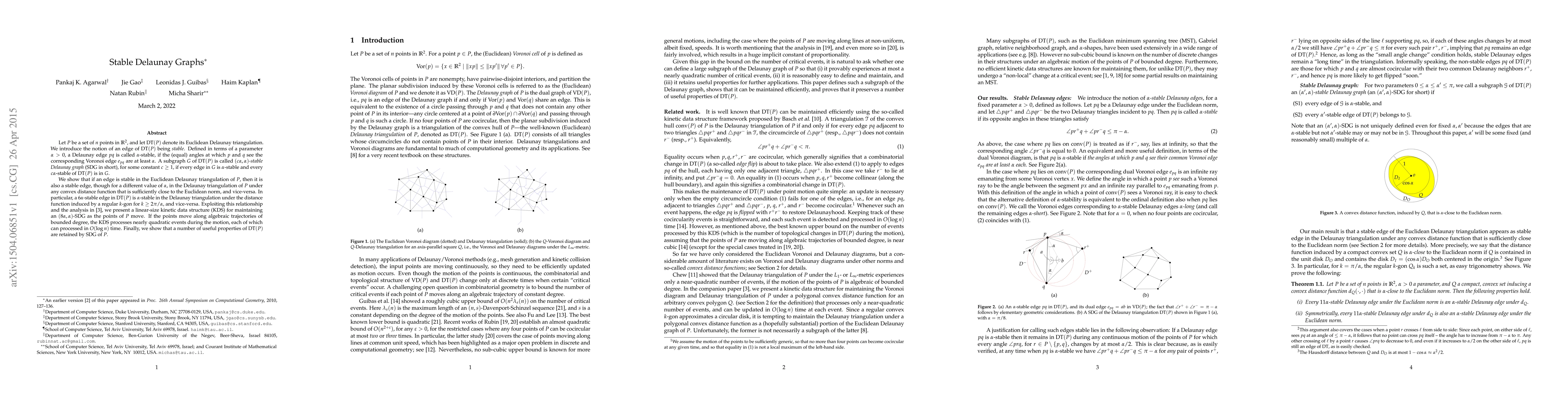 Let $P$ be a set of $n$ points in $\mathrm{R}^2$, and let $\mathrm{DT}(P)$ denote its Euclidean Delaunay triangulation. We introduce the notion of an edge of $\mathrm{DT}(P)$ being {\it stable}. Defined in terms of a parameter $\alpha>0$, a Delaunay edge $pq$ is called $\alpha$-stable, if the (equal) angles at which $p$ and $q$ see the corresponding Voronoi edge $e_{pq}$ are at least $\alpha$. A subgraph $G$ of $\mathrm{DT}(P)$ is called {\it $(c\alpha, \alpha)$-stable Delaunay graph} ($\mathrm{SDG}$ in short), for some constant $c \ge 1$, if every edge in $G$ is $\alpha$-stable and every $c\alpha$-stable of $\mathrm{DT}(P)$ is in $G$. We show that if an edge is stable in the Euclidean Delaunay triangulation of $P$, then it is also a stable edge, though for a different value of $\alpha$, in the Delaunay triangulation of $P$ under any convex distance function that is sufficiently close to the Euclidean norm, and vice-versa. In particular, a $6\alpha$-stable edge in $\mathrm{DT}(P)$ is $\alpha$-stable in the Delaunay triangulation under the distance function induced by a regular $k$-gon for $k \ge 2\pi/\alpha$, and vice-versa. Exploiting this relationship and the analysis in~\cite{polydel}, we present a linear-size kinetic data structure (KDS) for maintaining an $(8\alpha,\alpha)$-$\mathrm{SDG}$ as the points of $P$ move. If the points move along algebraic trajectories of bounded degree, the KDS processes nearly quadratic events during the motion, each of which can processed in $O(\log n)$ time. Finally, we show that a number of useful properties of $\mathrm{DT}(P)$ are retained by $\mathrm{SDG}$ of $P$.