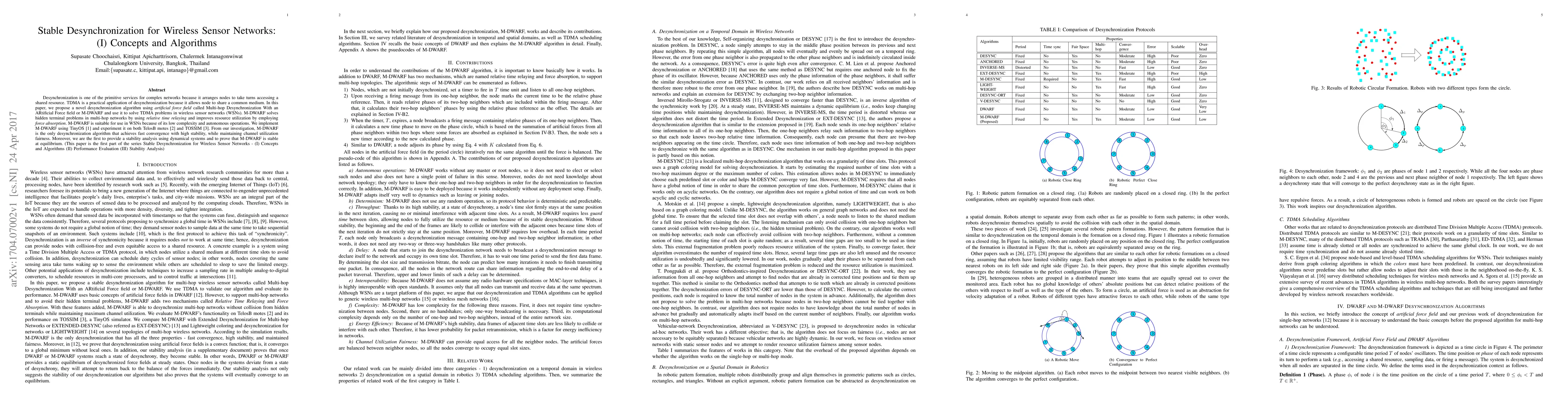 Desynchronization is one of the primitive services for complex networks because it arranges nodes to take turns accessing a shared resource. TDMA is a practical application of desynchronization because it allows node to share a common medium. In this paper, we propose a novel desynchronization algorithm using artificial force field called Multi-hop Desynchronization With an ARtificial Force field or M-DWARF and use it to solve TDMA problems in wireless sensor networks (WSNs). M-DWARF solves hidden terminal problems in multi-hop networks by using relative time relaying and improves resource utilization by employing force absorption. M-DWARF is suitable for use in WSNs because of its low complexity and autonomous operations. We implement M-DWARF using TinyOS and experiment it on both TelosB motes and TOSSIM. From our investigation, M-DWARF is the only desynchronization algorithm that achieves fast convergence with high stability, while maintaining channel utilization fairness. Moreover, we are the first to provide a stability analysis using dynamical systems and to prove that M-DWARF is stable at equilibrium. (This paper is the first part of the series Stable Desynchronization for Wireless Sensor Networks - (I) Concepts and Algorithms (II) Performance Evaluation (III) Stability Analysis)