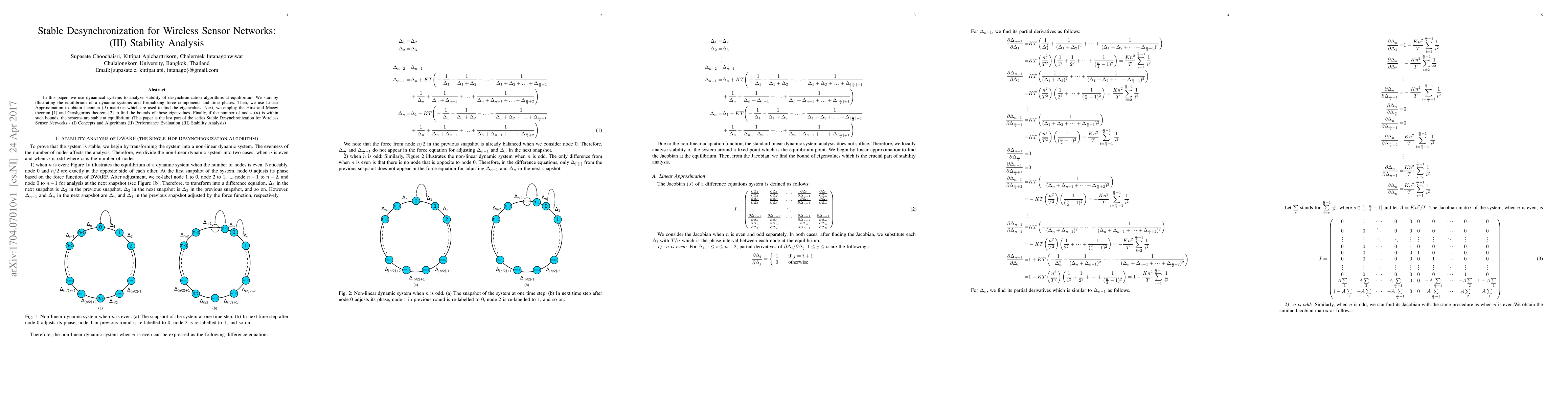 In this paper, we use dynamical systems to analyze stability of desynchronization algorithms at equilibrium. We start by illustrating the equilibrium of a dynamic systems and formalizing force components and time phases. Then, we use Linear Approximation to obtain Jaconian (J) matrixes which are used to find the eigenvalues. Next, we employ the Hirst and Macey theorem and Gershgorins theorem to find the bounds of those eigenvalues. Finally, if the number of nodes (n) is within such bounds, the systems are stable at equilibrium. (This paper is the last part of the series Stable Desynchronization for Wireless Sensor Networks - (I) Concepts and Algorithms (II) Performance Evaluation (III) Stability Analysis)