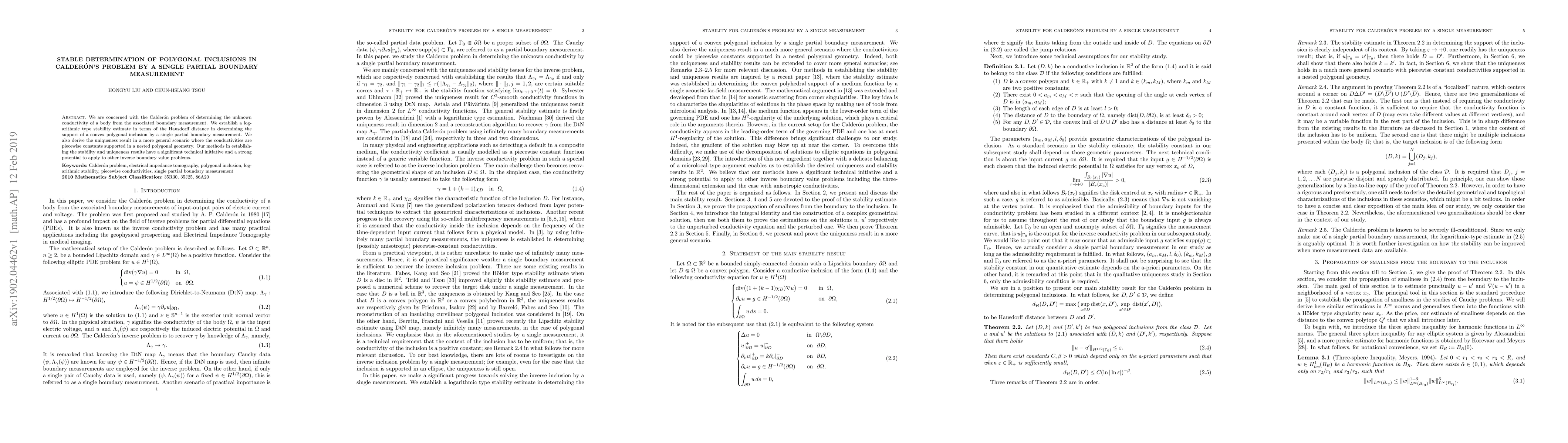 This paper addresses the Calder\'on problem, providing a stability estimate for determining the support of convex polygonal inclusions from a single partial boundary measurement. It establishes a logarithmic stability bound and proves uniqueness for piecewise constant conductivities in a nested polygonal geometry, with methods that hold promise for broader applications in inverse boundary value problems.