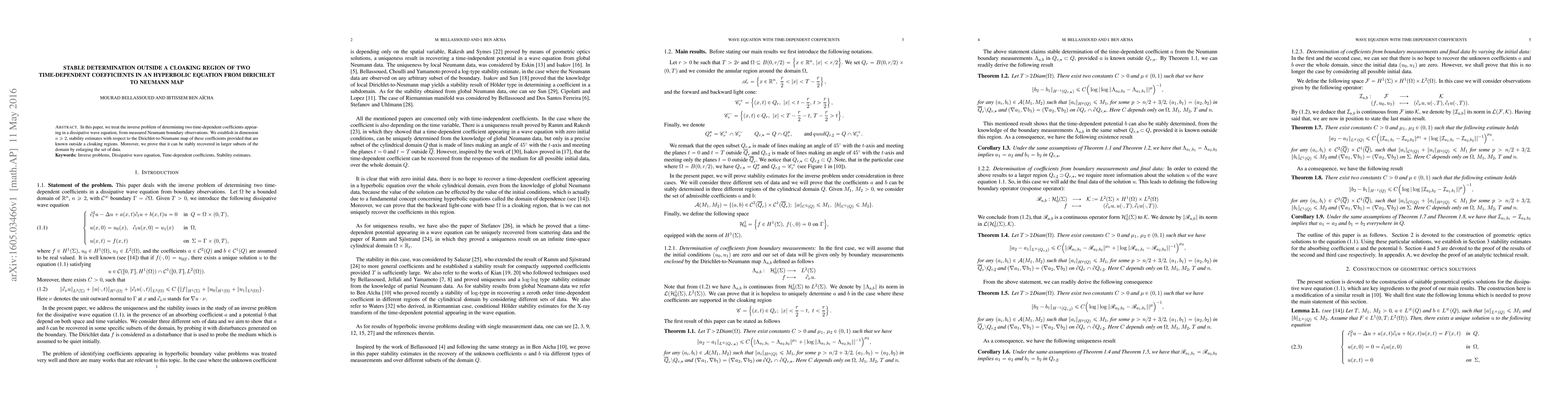 Researchers develop a method to stabilize the determination of two time-dependent coefficients in a hyperbolic equation from measured boundary data, with stability guarantees outside a cloaking region.