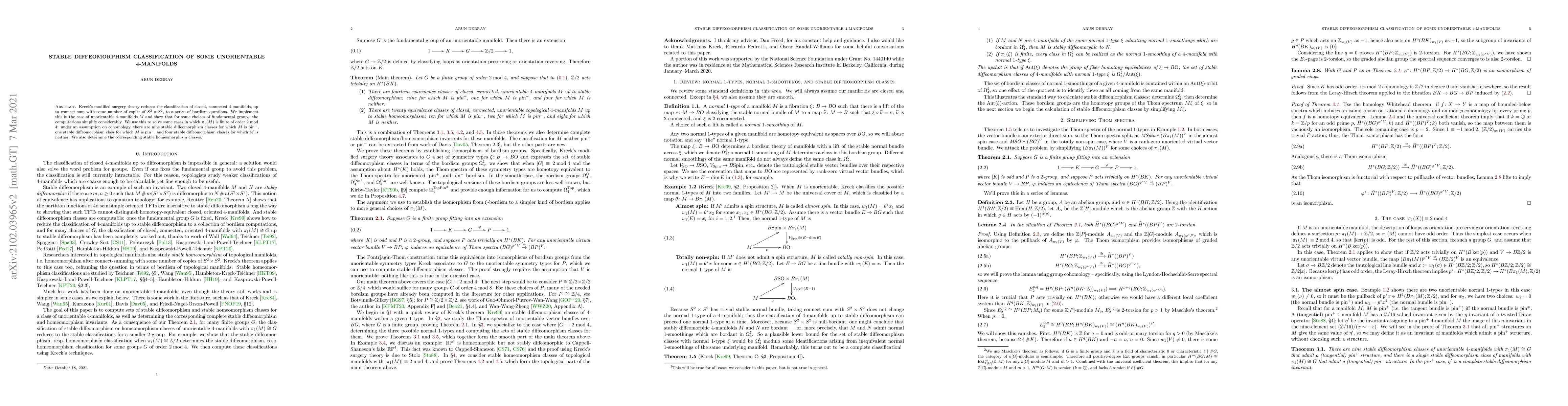 Kreck's modified surgery theory reduces the classification of closed, connected 4-manifolds, up to connect sum with some number of copies of $S^2\times S^2$, to a series of bordism questions. We implement this in the case of unorientable 4-manifolds M and show that for some choices of fundamental groups, the computations simplify considerably. We use this to solve some cases in which $\pi_1(M)$ is finite of order 2 mod 4: under an assumption on cohomology, there are nine stable diffeomorphism classes for which M is pin$^+$, one stable diffeomorphism class for which M is pin$^-$, and four stable diffeomorphism classes for which M is neither. We also determine the corresponding stable homeomorphism classes.