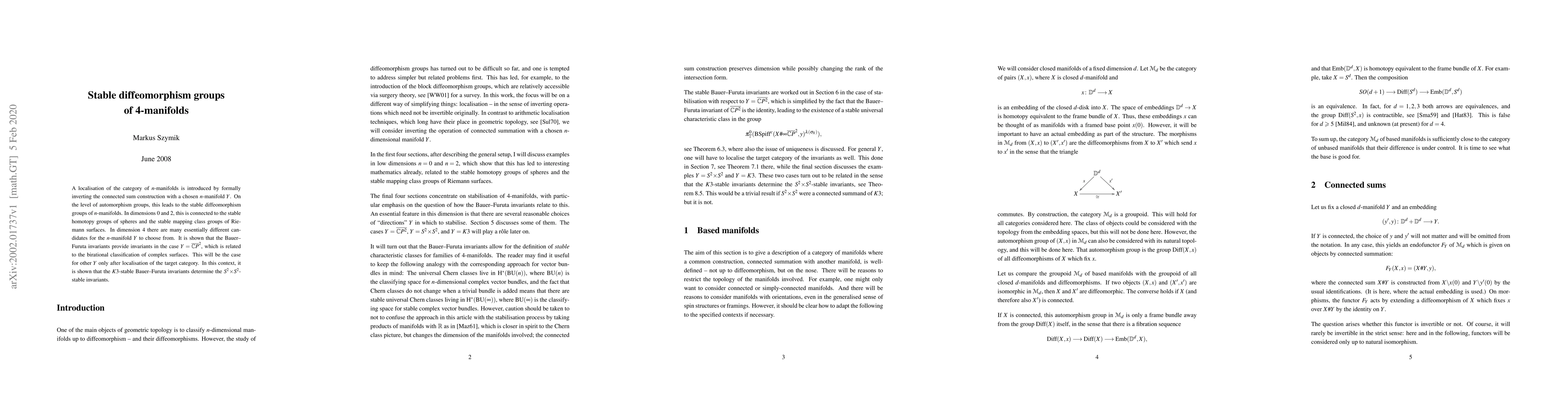 A localisation of the category of n-manifolds is introduced by formally inverting the connected sum construction with a chosen n-manifold Y. On the level of automorphism groups, this leads to the stable diffeomorphism groups of n-manifolds. In dimensions 0 and 2, this is connected to the stable homotopy groups of spheres and the stable mapping class groups of Riemann surfaces. In dimension 4 there are many essentially different candidates for the n-manifold Y to choose from. It is shown that the Bauer--Furuta invariants provide invariants in the case Y = CP^2, which is related to the birational classification of complex surfaces. This will be the case for other Y only after localisation of the target category. In this context, it is shown that the K3-stable Bauer--Furuta invariants determine the S^2xS^2-stable invariants.