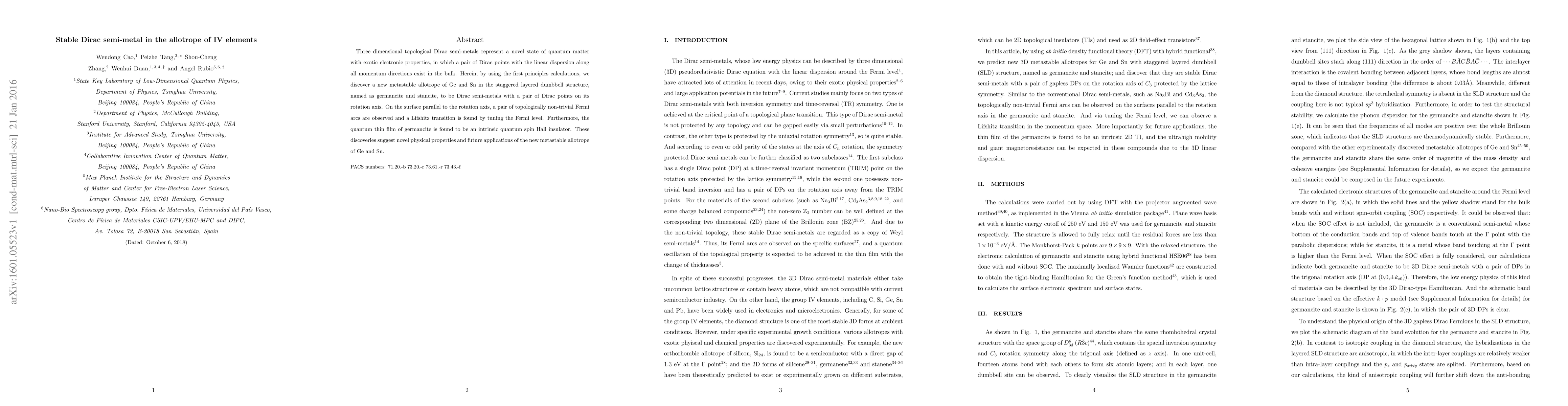 New allotrope of Ge and Sn, germancite and stancite, discovered as stable Dirac semi-metals with unique electronic properties, including Fermi arcs and quantum spin Hall insulator behavior.