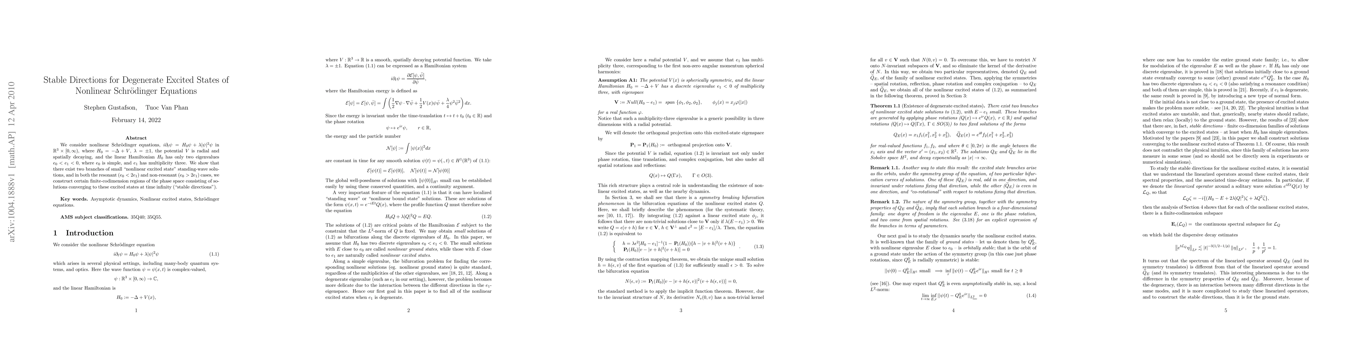 We consider nonlinear Schr\"{o}dinger equations, $i\partial_t \psi = H_0 \psi + \lambda |\psi|^2\psi$ in $\mathbb{R}^3 \times [0,\infty)$, where $H_0 = -\Delta + V$, $\lambda=\pm 1$, the potential $V$ is radial and spatially decaying, and the linear Hamiltonian $H_0$ has only two eigenvalues $e_0 < e_1 <0$, where $e_0$ is simple, and $e_1$ has multiplicity three. We show that there exist two branches of small "nonlinear excited state" standing-wave solutions, and in both the resonant ($e_0 < 2e_1$) and non-resonant ($e_0 > 2e_1$) cases, we construct certain finite-codimension regions of the phase space consisting of solutions converging to these excited states at time infinity ("stable directions").