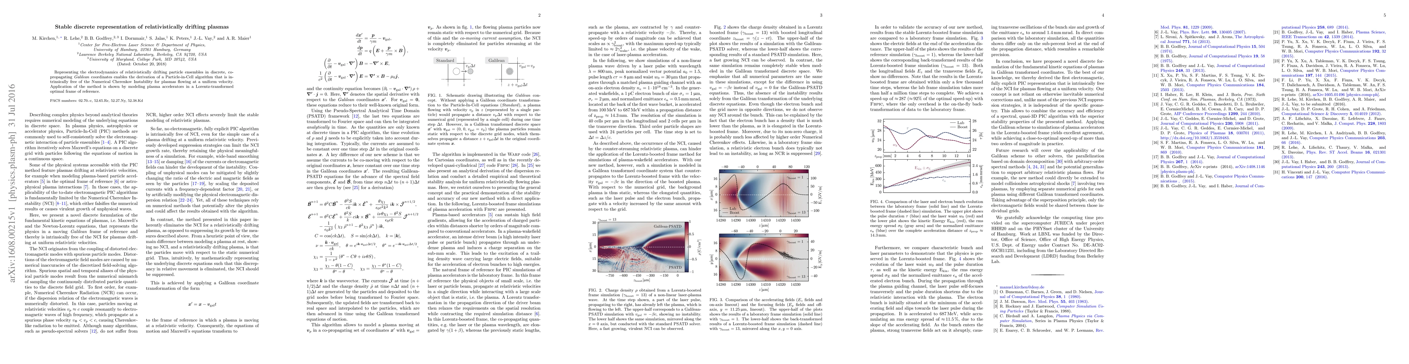 This paper presents a stable discrete representation for relativistically drifting plasmas using a Particle-in-Cell algorithm in co-propagating coordinates, which eliminates the Numerical Cherenkov Instability. The method is demonstrated through modeling plasma accelerators in an optimal Lorentz-transformed frame.
