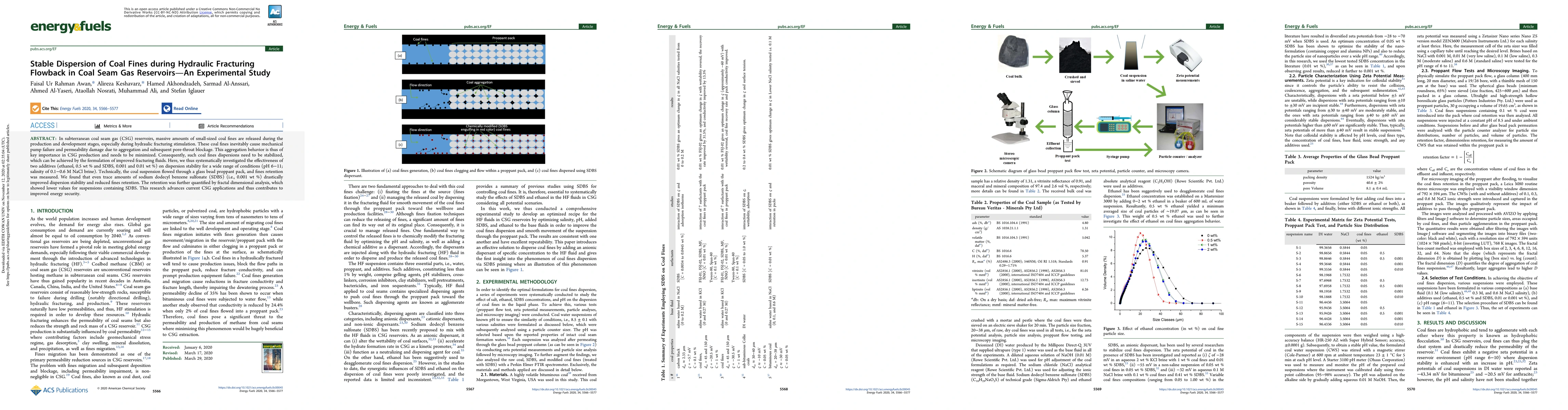 In subterranean coal seam gas CSG reservoirs, massive amounts of small-sized coal fines are released during the production and development stages, especially during hydraulic fracturing stimulation. These coal fines inevitably cause mechanical pump failure and permeability damage due to aggregation and subsequent pore throat blockage. This aggregation behavior is thus of key importance in CSG production and needs to be minimized. Consequently, such coal fines dispersions need to be stabilized, which can be achieved by the formulation of improved fracturing fluids. Here, we thus systematically investigated the effectiveness of two additives; ethanol, 0.5 wt percent and SDBS, 0.001 and 0.01 wt percent, on dispersion stability for a wide range of conditions: pH 6 to 11, salinity of 0.1 to 0.6 M NaCl brine. Technically, the coal suspension flowed through a glass bead proppant pack, and fines retention was measured. We found that even trace amounts of sodium dodecylbenzene sulfonate SDBS i.e. 0.001 wt per cent drastically improved dispersion stability and reduced fines retention. The retention was further quantified by fractal dimensional analysis, which showed lower values for suspensions containing SDBS. This research advances current CSG applications and thus contributes to improved energy security.