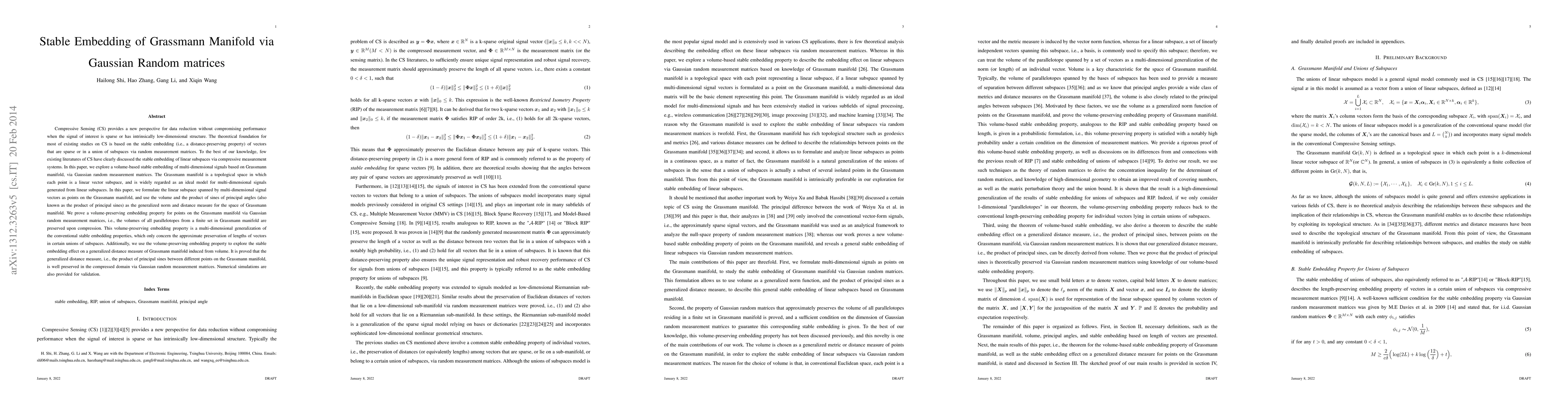 This paper presents a volume-based stable embedding of multi-dimensional signals on the Grassmann manifold using Gaussian random measurement matrices, preserving the volumes of parallelotopes and the generalized distance measure, i.e., the product of principal sines, in the compressed domain. Numerical simulations validate the proposed embedding method.