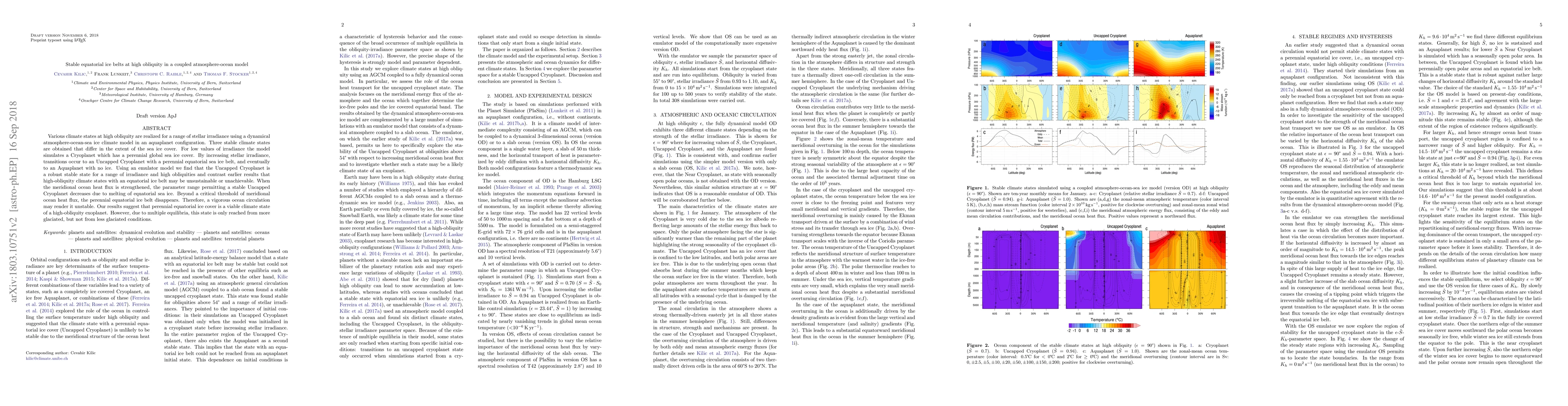 Various climate states at high obliquity are realized for a range of stellar irradiance using a dynamical atmosphere-ocean-sea ice climate model in an Aquaplanet configuration. Three stable climate states are obtained that differ in the extent of the sea ice cover. For low values of irradiance the model simulates a Cryoplanet that has a perennial global sea ice cover. By increasing stellar irradiance, transitions occur to an Uncapped Cryoplanet with a perennial equatorial sea ice belt, and eventually to an Aquaplanet with no ice. Using an emulator model we find that the Uncapped Cryoplanet is a robust stable state for a range of irradiance and high obliquities and contrast earlier results that high-obliquity climate states with an equatorial ice belt may be unsustainable or unachievable. When the meridional ocean heat flux is strengthened, the parameter range permitting a stable Uncapped Cryoplanet decreases due to melting of equatorial sea ice. Beyond a critical threshold of meridional ocean heat flux, the perennial equatorial ice belt disappears. Therefore, a vigorous ocean circulation may render it unstable. Our results suggest that perennial equatorial ice cover is a viable climate state of a high-obliquity exoplanet. However, due to multiple equilibria, this state is only reached from more glaciated conditions, and not from less glaciated conditions.