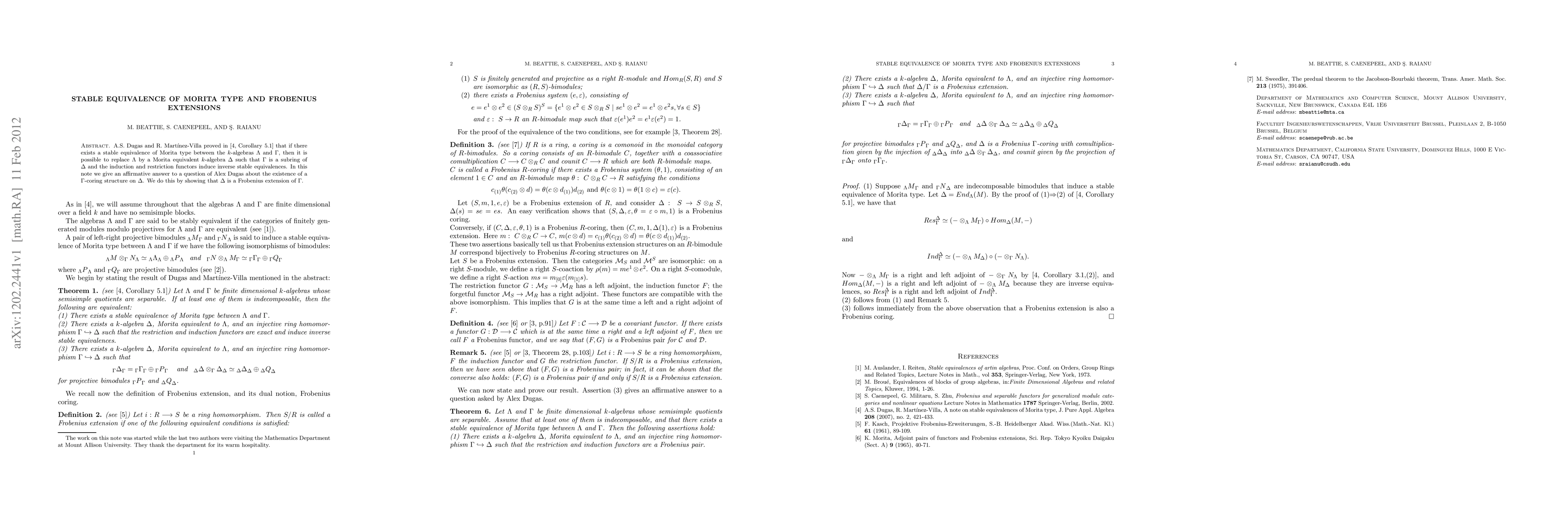 This paper establishes that if there exists a stable equivalence of Morita type between two $k$-algebras $\Lambda$ and $\Gamma$, then $\Lambda$ can be replaced by a Morita equivalent algebra $\Delta$ where $\Gamma$ embeds as a subring, and $\Delta$ is shown to be a Frobenius extension of $\Gamma$, answering a question about $\Gamma$-coring structures on $\Delta$.