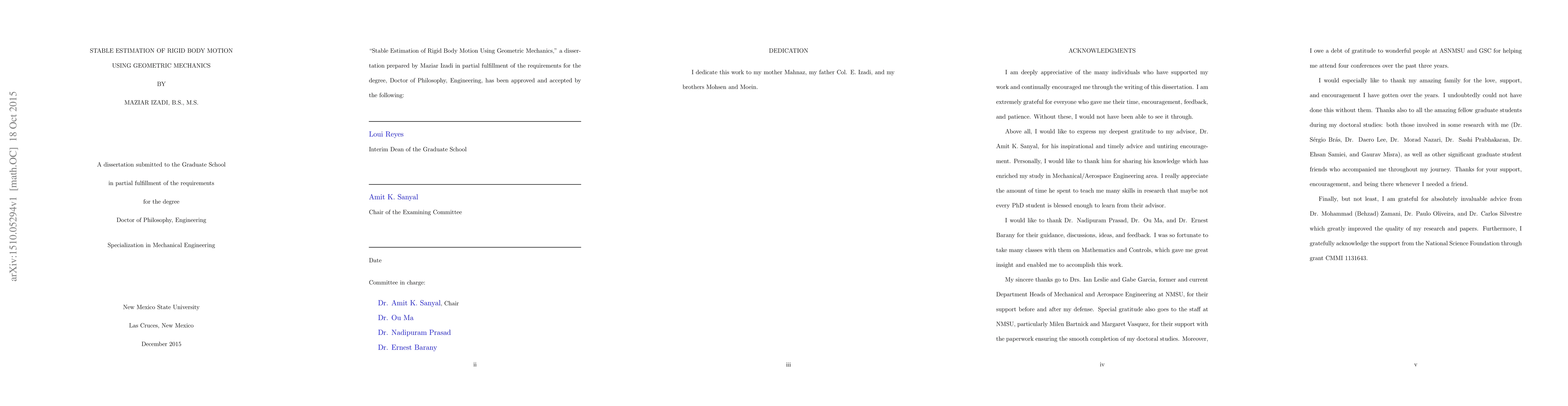 In this work, asymptotically stable state estimation schemes are proposed for rigid body motion, using the framework of geometric mechanics. Rigorous stability analyses of the estimation schemes presented here guarantee the nonlinear stability of these schemes. The stability of these schemes does not depend on the characteristics of the sensor measurement noise or external disturbances. In addition, they are robust to initial errors in the state estimates and do not need to be re-tuned when sensor noise properties change. In the first part of this dissertation, estimation of rigid body states is considered, given the dynamics model of the rigid body. In the second part, an estimation scheme that does not require knowledge of the dynamics of the rigid body is derived, based on onboard sensor measurements obtained at an appropriate frequency. The frequency of such measurements must be suitably high to resolve the motion of the rigid body. These attitude and pose estimation schemes are obtained by applying the Lagrange-d'Alembert principle from variational mechanics, to a Lagrangian constructed from state estimation errors and a dissipative term linear in the velocity estimation errors.