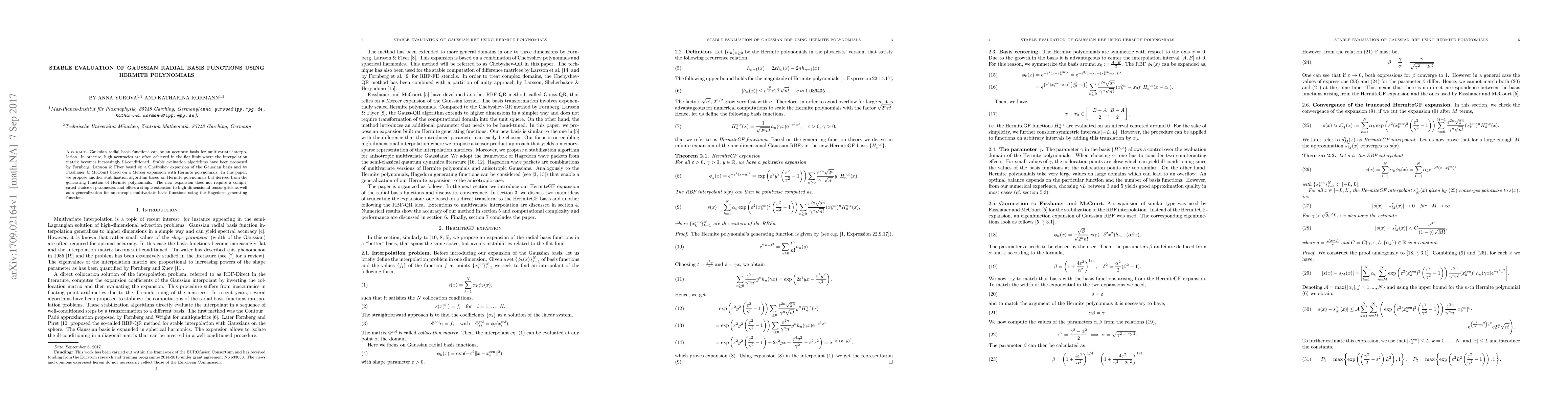 This paper proposes a new stabilization algorithm for evaluating Gaussian radial basis functions using Hermite polynomials, derived from the generating function. Unlike previous methods, it avoids complex parameter choices and extends easily to high-dimensional tensor grids and anisotropic multivariate basis functions.