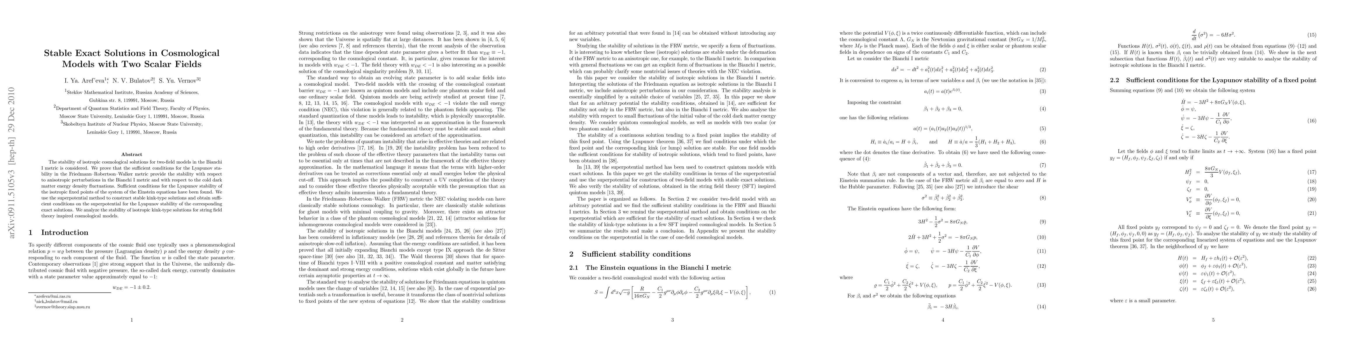 This paper investigates the stability of isotropic cosmological solutions in two-field models under the Bianchi I metric, demonstrating that conditions for stability in the Friedmann-Robertson-Walker metric also apply to anisotropic perturbations and cold dark matter fluctuations. The authors utilize the superpotential method to construct stable kink-type solutions and establish sufficient conditions for their Lyapunov stability.