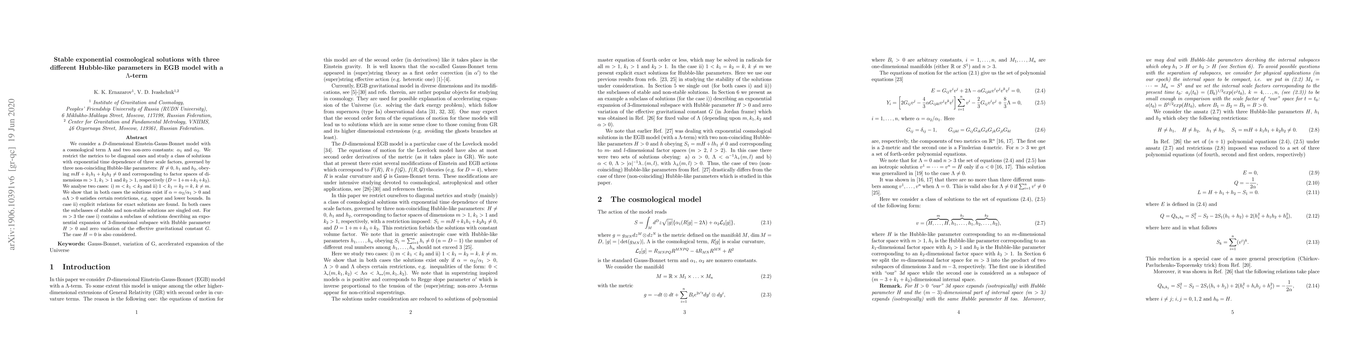 This paper explores stable exponential cosmological solutions in a $D$-dimensional Einstein-Gauss-Bonnet model with a cosmological constant $\Lambda$, focusing on three distinct Hubble-like parameters. It identifies conditions under which solutions exist and classifies them as stable or non-stable, particularly highlighting a subclass for $m > 3$ with an expanding 3-dimensional subspace.