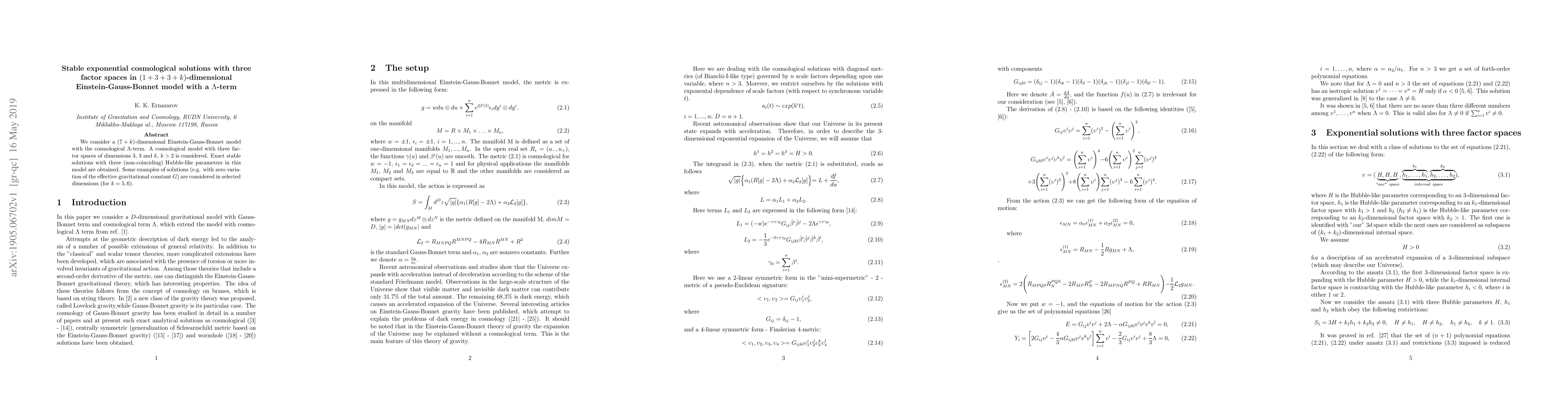 This paper explores stable exponential cosmological solutions in a $(7 + k)$-dimensional Einstein-Gauss-Bonnet model with a $\Lambda$-term, featuring three factor spaces of dimensions $3$, $3$, and $k$ ($k > 2$). Exact stable solutions with three distinct Hubble-like parameters are derived, with specific examples analyzed for $k = 5$ and $6$.