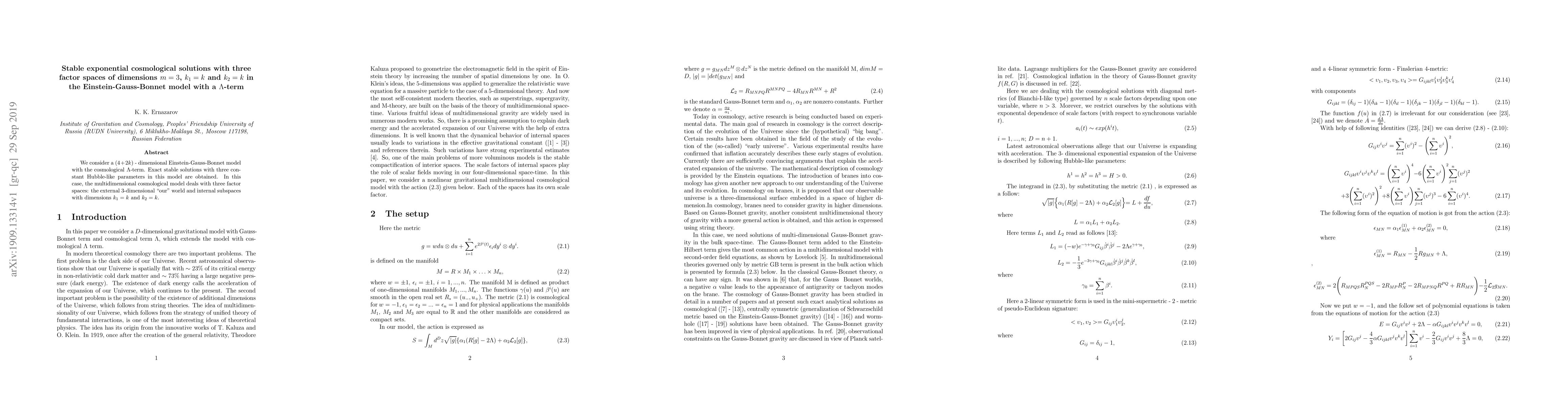 We consider a $(4 + 2k)$ - dimensional Einstein-Gauss-Bonnet model with the cosmological $\Lambda$-term. Exact stable solutions with three constant Hubble-like parameters in this model are obtained. In this case, the multidimensional cosmological model deals with three factor spaces: the external 3-dimensional "our" world and internal subspaces with dimensions $k_1 = k$ and $k_2=k$.