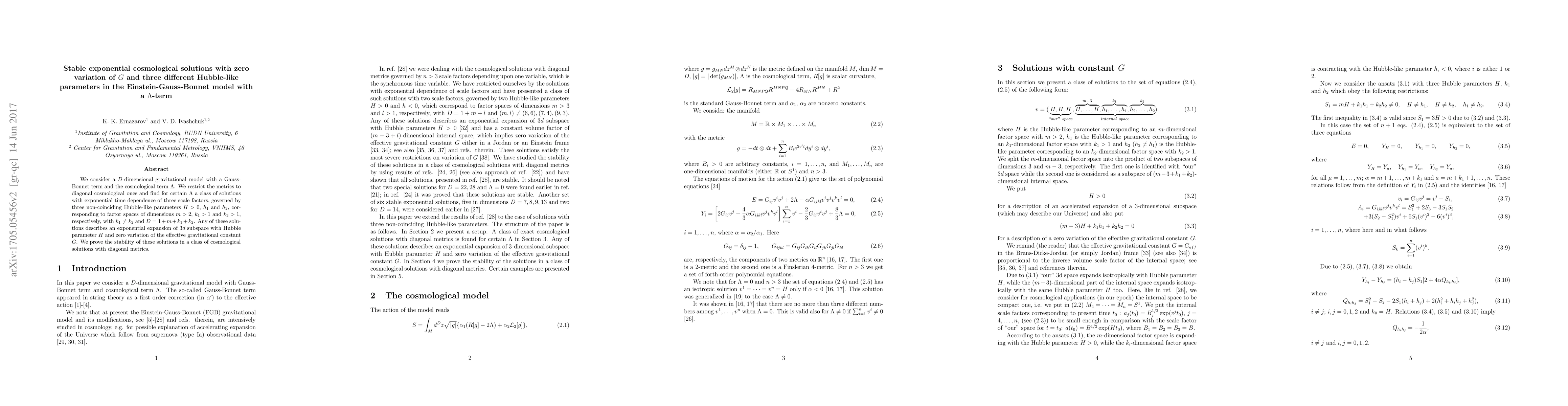 This paper explores $D$-dimensional Einstein-Gauss-Bonnet models with a cosmological term $\Lambda$, identifying stable exponential cosmological solutions with three distinct Hubble-like parameters and zero variation in the gravitational constant $G$. The solutions describe an expanding $3d$ subspace with stability proven for diagonal metrics.