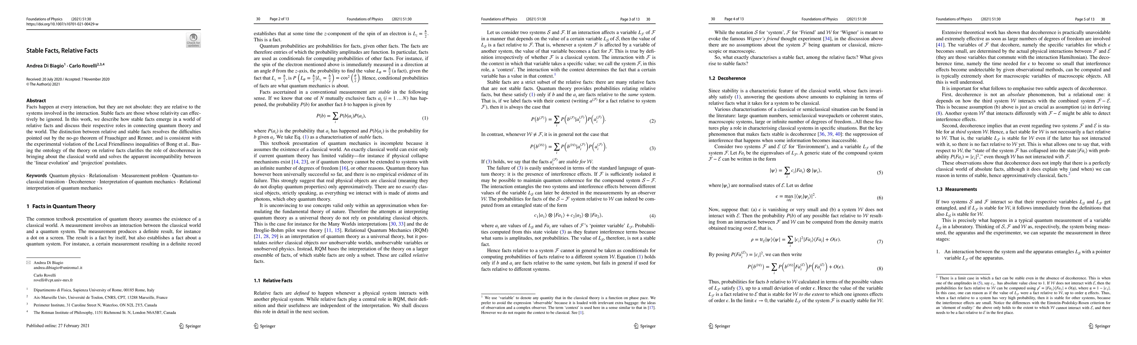 This paper explores the emergence of stable facts from relative facts in quantum interactions, addressing the challenges posed by Frauchiger-Renner and other no-go theorems. It proposes that basing the theory's ontology on relative facts resolves the conflict between quantum theory's linear evolution and the projection postulate, clarifying the role of decoherence in classical world emergence.