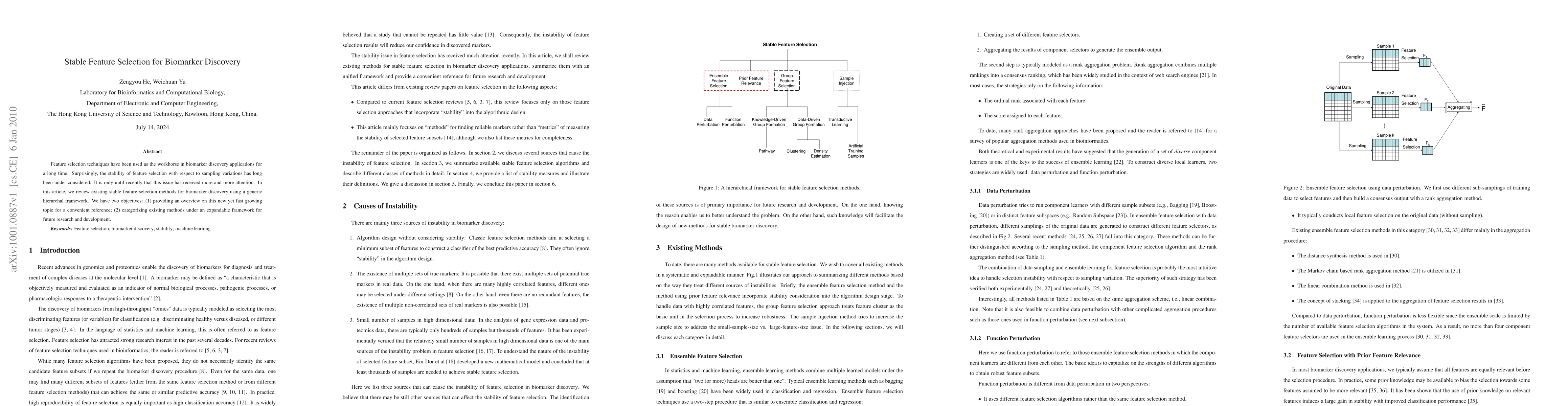 This paper reviews stable feature selection methods for biomarker discovery, emphasizing the importance of stability against sampling variations. It provides an overview of existing techniques and categorizes them within a hierarchical framework to facilitate future research.