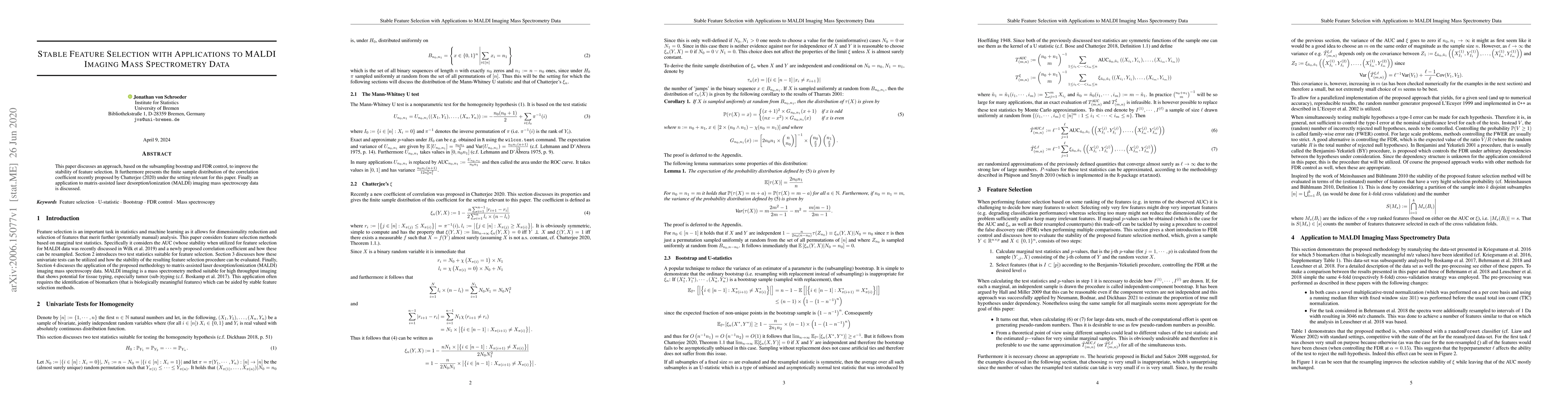This research contributes to the field of feature selection by providing a stable method that can be applied to high-dimensional datasets, such as those from MALDI imaging mass spectrometry, with potential benefits for biomarker discovery and classification tasks.