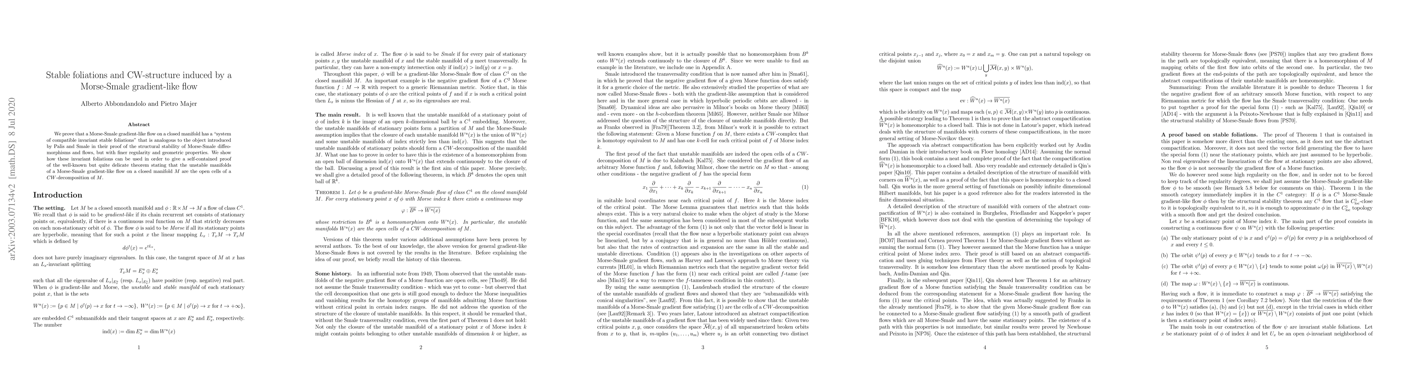 This paper proves the existence of stable foliations in a Morse-Smale gradient-like flow on a closed manifold, demonstrating finer regularity and geometric properties. It also provides a self-contained proof that the unstable manifolds form the open cells of a CW-structure on the manifold.