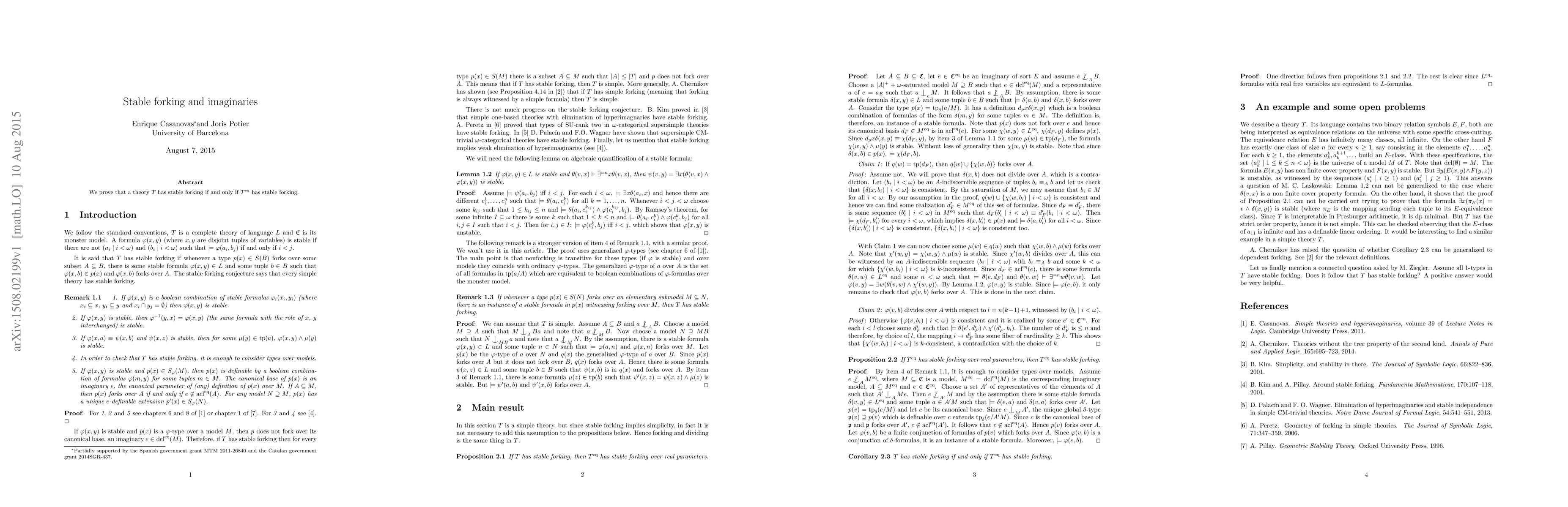 Summary: This paper establishes an equivalence between stable forking in a theory $T$ and stable forking in its equilogical counterpart $T^\mathrm{eq}$. The result provides a foundational link between these two concepts in model theory.