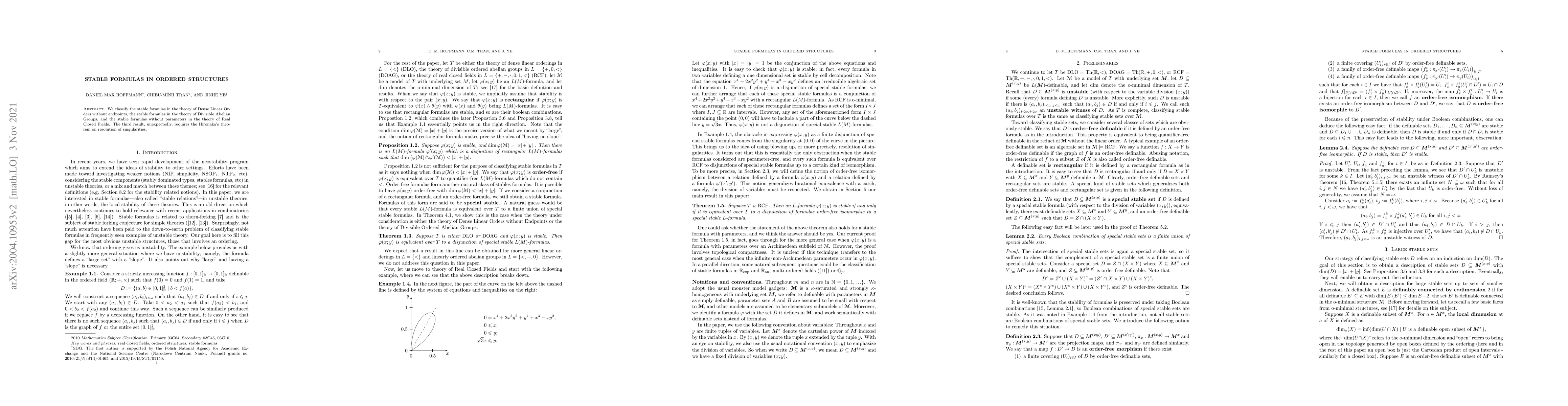 This paper classifies stable formulas in Dense Linear Orders without endpoints, Divisible Abelian Groups, and Real Closed Fields, with the Real Closed Field result surprisingly relying on Hironaka's theorem on resolution of singularities.